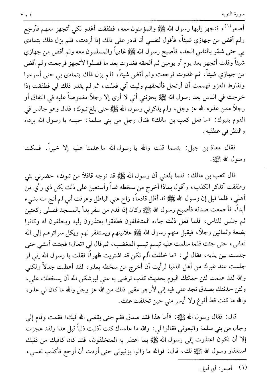 قَالَ كَعْبُ بْنُ مَالِكٍ: فَلَمَّا بَلَغَنِي أَنَّ رَسُولَ اللَّهِ صَلَّى اللَّهُ عَلَيْهِ وسلم قد توجه قافلا من تبوك، حضرني بثي وطفقت أَتَذَكَّرُ الْكَذِبَ، وَأَقُولُ بِمَاذَا أَخْرُجُ مِنْ سُخْطِهِ غدا وأستعين على ذلك بكل ذِي رَأْيٍ مِنْ أَهْلِي، فَلَمَّا قِيلَ إِنَّ رسول الله صلى الله عليه وسلم قد أَظَلَّ قَادِمًا، زَاحَ عَنِّي الْبَاطِلُ وَعَرَفْتُ أَنِّي لَمْ أَنْجُ مِنْهُ بِشَيْءٍ أَبَدًا، فَأَجْمَعْتُ صِدْقَهُ فَأَصْبَحَ رَسُولُ اللَّهِ صَلَّى اللَّهُ عَلَيْهِ وَسَلَّمَ وَكَانَ إِذَا قَدِمَ مِنْ سَفَرٍ بَدَأَ بِالْمَسْجِدِ فصلى رَكْعَتَيْنِ ثُمَّ جَلَسَ لِلنَّاسِ، فَلَمَّا فَعَلَ ذَلِكَ جَاءَهُ الْمُتَخَلِّفُونَ فَطَفِقُوا يَعْتَذِرُونَ إِلَيْهِ وَيَحْلِفُونَ لَهُ وكانوا بضعة وثمانين رجلا، فيقبل مِنْهُمْ رَسُولُ اللَّهِ صَلَّى اللَّهُ عَلَيْهِ وَسَلَّمَ عَلَانِيَتَهُمْ وَيَسْتَغْفِرُ لَهُمْ وَيَكِلُ سَرَائِرَهُمْ إِلَى اللَّهِ تَعَالَى، حَتَّى جِئْتُ فَلَمَّا سَلَّمْتُ عَلَيْهِ تَبَسَّمَ تَبَسُّمَ الْمُغْضَبِ، ثُمَّ قَالَ لِي «تَعَالَ» فَجِئْتُ أَمْشِي حَتَّى جَلَسْتُ بَيْنَ يَدَيْهِ، فَقَالَ لِي: «ما خلفك ألم تكن قد اشتريت ظهرا» فَقُلْتُ يَا رَسُولَ اللَّهِ إِنِّي لَوْ جَلَسْتُ عِنْدَ غَيْرِكَ مِنْ أَهْلِ الدُّنْيَا لَرَأَيْتُ أَنْ أَخْرُجَ مِنْ سُخْطِهِ بِعُذْرٍ، لَقَدْ أُعْطِيتُ جَدَلًا ولكني والله لقد علمت لئن حدثتك اليوم بحديث كذب ترضى به عني ليوشكن الله أن يُسْخِطُكَ عَلِيَّ، وَلَئِنْ حَدَّثْتُكَ بِصِدْقٍ تَجِدُ عَلَيَّ فيه إني لأرجو عقبى ذلك مِنَ اللَّهِ عَزَّ وَجَلَّ وَاللَّهِ مَا كَانَ لِي عُذْرٌ، وَاللَّهِ مَا كُنْتُ قَطُّ أَفْرَغُ وَلَا أَيْسَرُ مِنِّي حِينَ تَخَلَّفْتُ عَنْكَ.