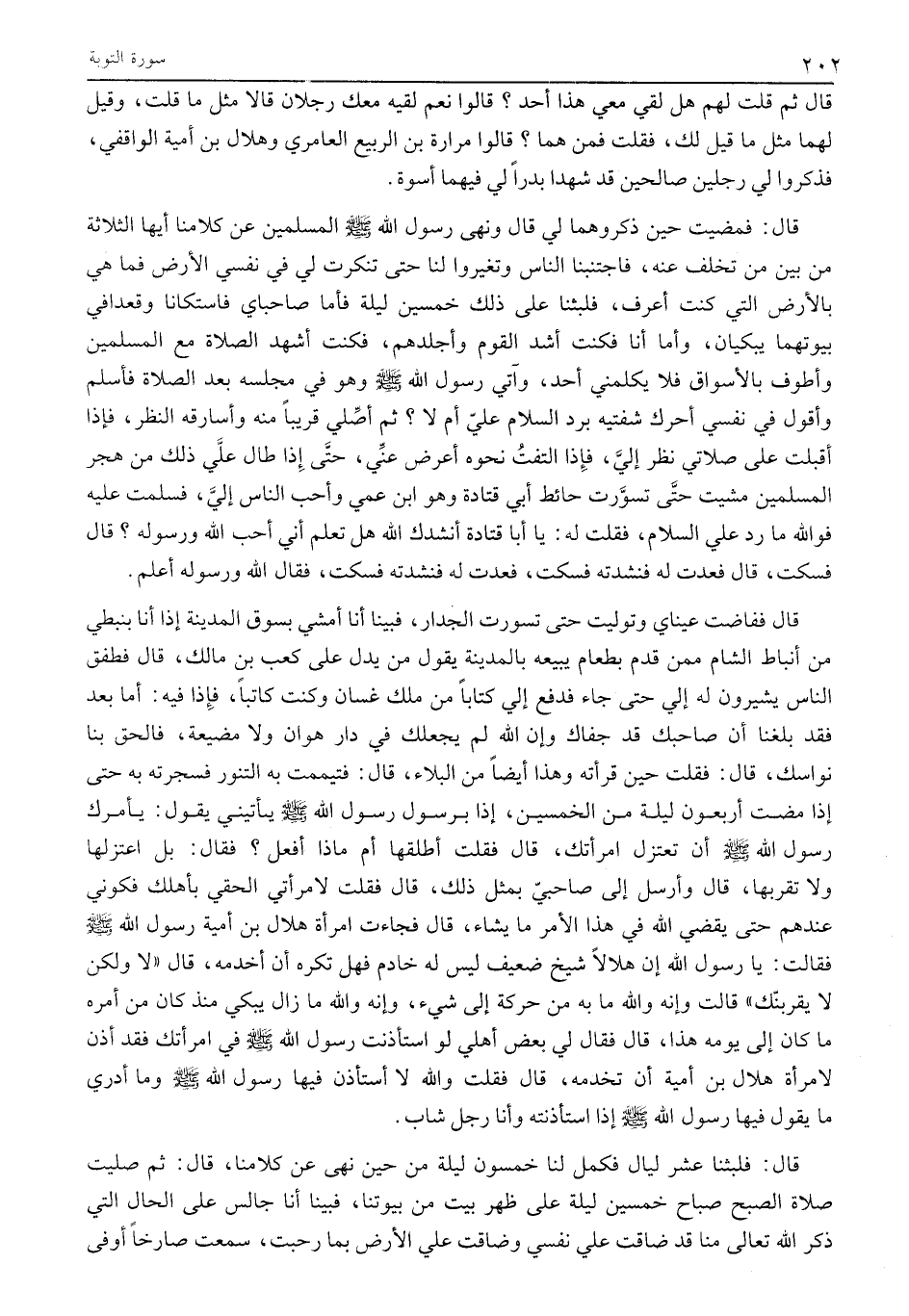 قَالَ: فَمَضَيْتُ حِينَ ذَكَرُوهُمَا لِي قَالَ وَنَهَى رَسُولُ اللَّهِ صَلَّى اللَّهُ عَلَيْهِ وَسَلَّمَ الْمُسْلِمِينَ عَنْ كَلَامِنَا أَيُّهَا الثَّلَاثَةُ مِنْ بَيْنِ مَنْ تَخَلَّفَ عَنْهُ، فَاجْتَنَبَنَا النَّاسُ وَتَغَيَّرُوا لَنَا حَتَّى تَنَكَّرَتْ لِي فِي نَفْسِي الْأَرْضُ فَمَا هِيَ بِالْأَرْضِ الَّتِي كُنْتُ أَعْرِفُ، فَلَبِثْنَا عَلَى ذَلِكَ خَمْسِينَ لَيْلَةً فَأَمَّا صَاحِبَايَ فَاسْتَكَانَا وَقَعَدَا فِي بُيُوتِهِمَا يَبْكِيَانِ، وَأَمَّا أنا فكنت أشد الْقَوْمِ وَأَجْلَدَهُمْ، فَكُنْتُ أَشْهَدُ الصَّلَاةَ مَعَ الْمُسْلِمِينَ وَأَطُوفُ بِالْأَسْوَاقِ فَلَا يُكَلِّمُنِي أَحَدٌ، وَآتِي رَسُولَ اللَّهِ صَلَّى اللَّهُ عَلَيْهِ وَسَلَّمَ وَهُوَ فِي مَجْلِسِهِ بَعْدَ الصَّلَاةِ فَأُسَلِّمُ وَأَقُولُ فِي نَفْسِي أحرك شَفَتَيْهِ بِرَدِّ السَّلَامِ عَلَيَّ أَمْ لَا؟ ثُمَّ أُصَلِّي قَرِيبًا مِنْهُ وَأُسَارِقُهُ النَّظَرَ، فَإِذَا أَقْبَلْتُ عَلَى صَلَاتِي نَظَرَ إِلَيَّ، فَإِذَا الْتَفَتُّ نَحْوَهُ أعرض عنّي، حَتَّى إِذَا طَالَ عَلَيَّ ذَلِكَ مِنْ هَجْرِ الْمُسْلِمِينَ مَشَيْتُ حَتَّى تَسَوَّرْتُ حَائِطَ أَبِي قَتَادَةَ وَهُوَ ابْنُ عَمِّي وَأَحَبُّ النَّاسِ إِلَيَّ، فَسَلَّمْتُ عليه فو الله مَا رَدَّ عَلَيَّ السَّلَامَ، فَقُلْتُ لَهُ: يَا أَبَا قَتَادَةَ أَنْشُدُكَ اللَّهَ هَلْ تَعْلَمُ أَنِّي أَحَبُّ اللَّهَ وَرَسُولَهُ؟ قَالَ فَسَكَتَ، قَالَ فَعُدْتُ له فنشدته فسكت، فعدت له فنشدته فسكت، فَقَالَ اللَّهُ وَرَسُولُهُ أَعْلَمُ.