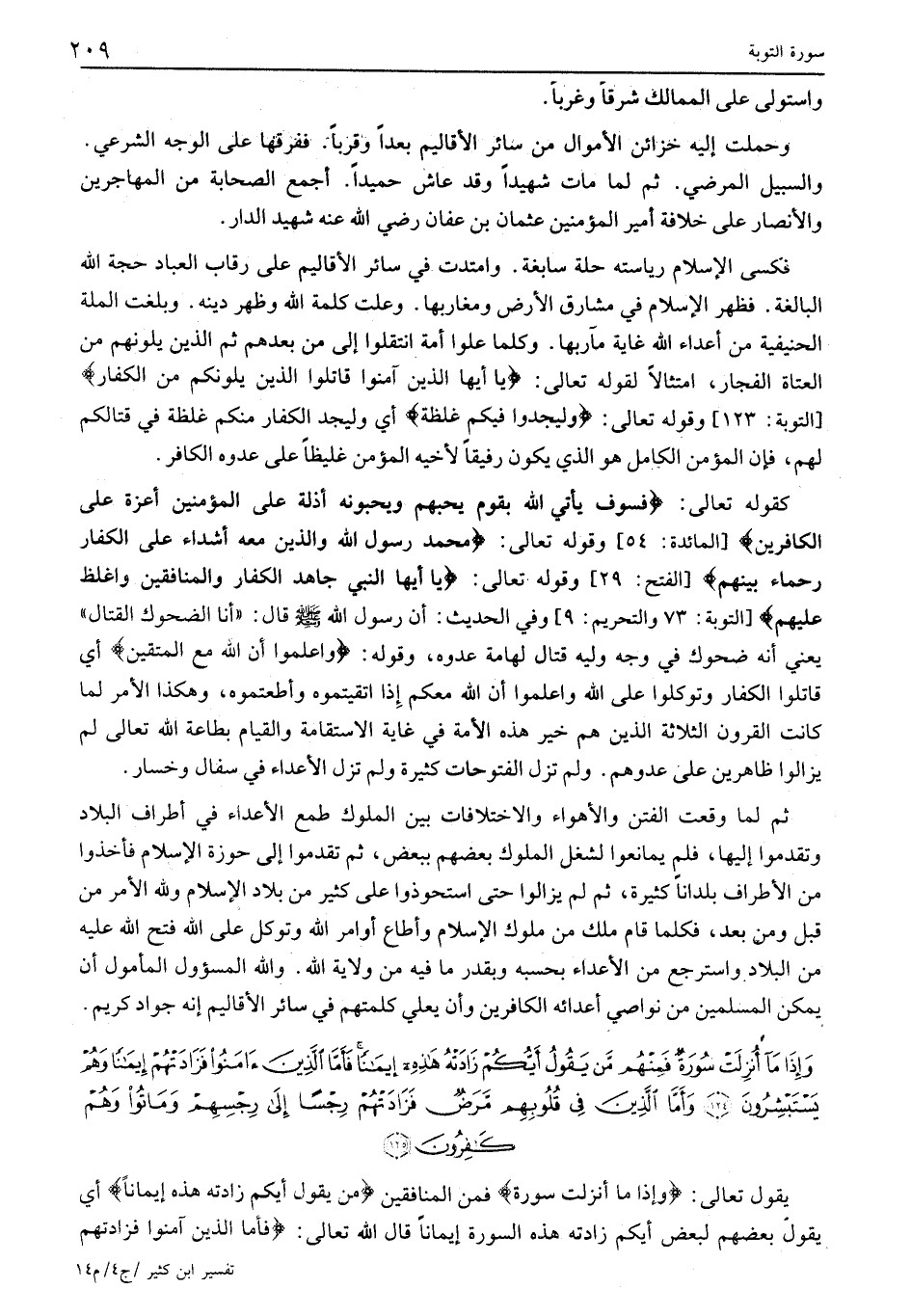 فكسى الإسلام رئاسته حلة سابغة. وامتدت فِي سَائِرِ الْأَقَالِيمِ عَلَى رِقَابِ الْعِبَادِ حُجَّةُ الله البالغة. فظهر الْإِسْلَامُ فِي مَشَارِقِ الْأَرْضِ وَمَغَارِبِهَا. وَعَلَتْ كَلِمَةُ الله وظهر دينه. وبلغت الملة الحنيفية من أعداء الله غاية مآربها. وكلما عَلَوْا أُمَّةً انْتَقَلُوا إِلَى مَنْ بَعْدِهِمْ ثُمَّ الَّذِينَ يَلُونَهُمْ مِنَ الْعُتَاةِ الْفُجَّارِ، امْتِثَالًا لِقَوْلِهِ تَعَالَى: يَا أَيُّهَا الَّذِينَ آمَنُوا قاتِلُوا الَّذِينَ يَلُونَكُمْ مِنَ الْكُفَّارِ [التَّوْبَةِ: 123] وَقَوْلُهُ تَعَالَى: وَلْيَجِدُوا فِيكُمْ غِلْظَةً أَيْ وَلِيَجِدَ الكفار منكم غلظة فِي قِتَالِكُمْ لَهُمْ، فَإِنَّ الْمُؤْمِنَ الْكَامِلَ هُوَ الَّذِي يَكُونُ رَفِيقًا لِأَخِيهِ الْمُؤْمِنِ غَلِيظًا عَلَى عدوه الكافر.