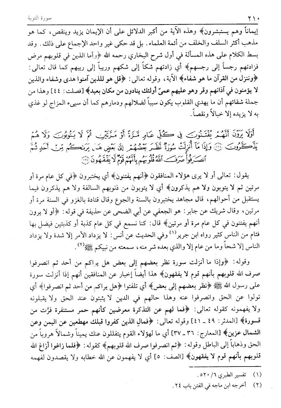 إِيماناً وَهُمْ يَسْتَبْشِرُونَ وَهَذِهِ الْآيَةُ مِنْ أَكْبَرِ الدَّلَائِلِ عَلَى أَنَّ الْإِيمَانَ يَزِيدُ وَيَنْقُصُ، كَمَا هُوَ مَذْهَبُ أَكْثَرِ السَّلَفِ وَالْخَلَفِ مِنْ أَئِمَّةِ العلماء. بل قد حكى غير واحد الإجماع على ذلك. وَقَدْ بُسِطَ الْكَلَامُ عَلَى هَذِهِ الْمَسْأَلَةِ فِي أَوَّلِ شَرْحِ الْبُخَارِيِّ رَحِمَهُ اللَّهُ وَأَمَّا الَّذِينَ فِي قُلُوبِهِمْ مَرَضٌ فَزادَتْهُمْ رِجْساً إِلَى رِجْسِهِمْ أَيْ زَادَتْهُمْ شَكًّا إِلَى شَكِّهِمْ وَرَيْبًا إِلَى رَيْبِهِمْ كَمَا قَالَ تَعَالَى: