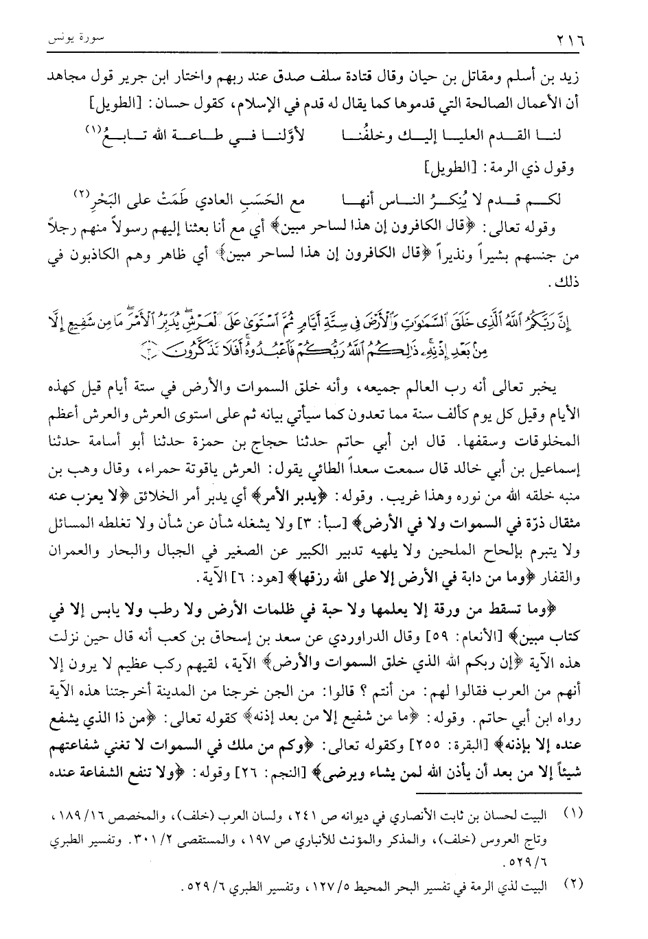 وَما تَسْقُطُ مِنْ وَرَقَةٍ إِلَّا يَعْلَمُها وَلا حَبَّةٍ فِي ظُلُماتِ الْأَرْضِ وَلا رَطْبٍ وَلا يابِسٍ إِلَّا فِي كِتابٍ مُبِينٍ [الْأَنْعَامِ: 59] وَقَالَ الدَّرَاوَرْدِيُّ عَنْ سَعْدِ بْنِ إِسْحَاقَ بْنِ كعب أَنَّهُ قَالَ حِينَ نَزَلَتْ هَذِهِ الْآيَةُ إِنَّ رَبَّكُمُ اللَّهُ الَّذِي خَلَقَ السَّماواتِ وَالْأَرْضَ الآية، لَقِيَهُمْ رَكْبٌ عَظِيمٌ لَا يَرَوْنَ إِلَّا أَنَّهُمْ مِنَ الْعَرَبِ فَقَالُوا لَهُمْ: مَنْ أَنْتُمْ؟ قَالُوا: مِنَ الْجِنِّ خَرَجْنَا مِنَ الْمَدِينَةِ أَخْرَجَتْنَا هَذِهِ الْآيَةُ رَوَاهُ ابْنُ أَبِي حَاتِمٍ. وَقَوْلُهُ: مَا مِنْ شَفِيعٍ إِلَّا مِنْ بَعْدِ إِذْنِهِ كَقَوْلِهِ تَعَالَى: مَنْ ذَا الَّذِي يَشْفَعُ عِنْدَهُ إِلَّا بِإِذْنِهِ [الْبَقَرَةِ: 255] وَكَقَوْلِهِ تَعَالَى: وَكَمْ مِنْ مَلَكٍ فِي السَّماواتِ لَا تُغْنِي شَفاعَتُهُمْ شَيْئاً إِلَّا مِنْ بَعْدِ أَنْ يَأْذَنَ اللَّهُ لِمَنْ يَشاءُ وَيَرْضى [النَّجْمِ: 26] وَقَوْلُهُ: وَلا تَنْفَعُ الشَّفاعَةُ عِنْدَهُ