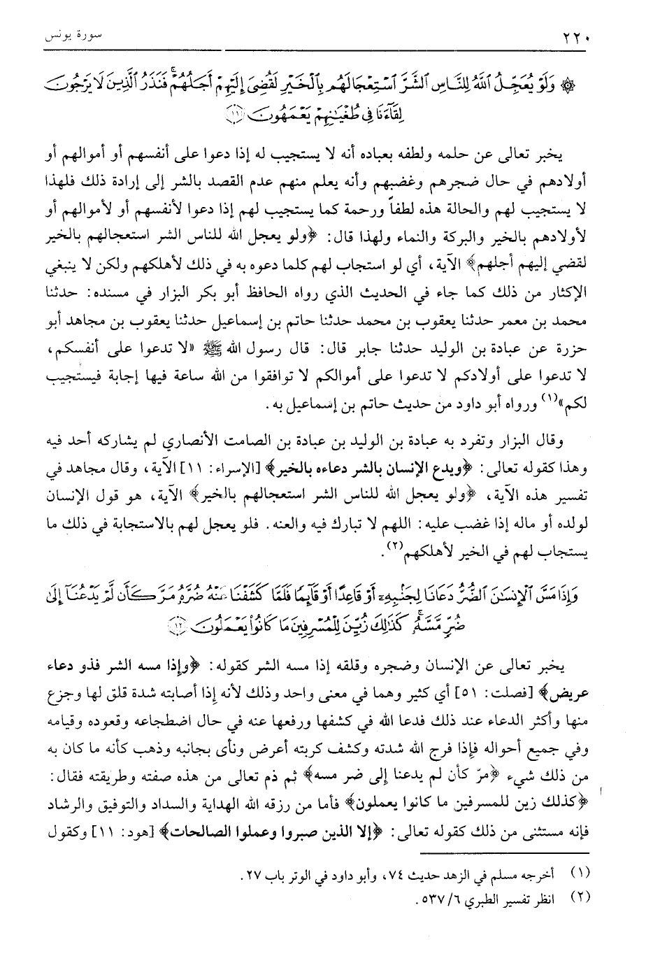 الآية، أي لو استجاب لهم كلما دَعَوْهُ بِهِ فِي ذَلِكَ لَأَهْلَكَهُمْ وَلَكِنْ لَا يَنْبَغِي الْإِكْثَارُ مِنْ ذَلِكَ كَمَا جَاءَ فِي الْحَدِيثُ الَّذِي رَوَاهُ الْحَافِظُ أَبُو بَكْرٍ الْبَزَّارُ فِي مُسْنَدِهِ: حَدَّثَنَا مُحَمَّدُ بْنُ مَعْمَرٍ حَدَّثَنَا يَعْقُوبُ بْنُ مُحَمَّدٍ حَدَّثَنَا حَاتِمُ بْنُ إِسْمَاعِيلَ حَدَّثَنَا يَعْقُوبُ بْنُ مُجَاهِدٍ أَبُو حَزْرَةَ عَنْ عُبَادَةَ بْنِ الْوَلِيدِ حَدَّثَنَا جَابِرٍ قَالَ: قَالَ رَسُولُ اللَّهِ صَلَّى اللَّهُ عليه وسلم «لا تَدْعُوَا عَلَى أَنْفُسِكُمْ، لَا تَدْعُوا عَلَى أَوْلَادِكُمْ لَا تَدْعُوا عَلَى أَمْوَالِكُمْ لَا تُوَافِقُوا مِنَ اللَّهِ سَاعَةً فِيهَا إِجَابَةٌ فَيَسْتَجِيبُ لَكُمْ» «1» وَرَوَاهُ أَبُو دَاوُدَ مِنْ حَدِيثِ حَاتِمِ بْنِ إِسْمَاعِيلَ به.