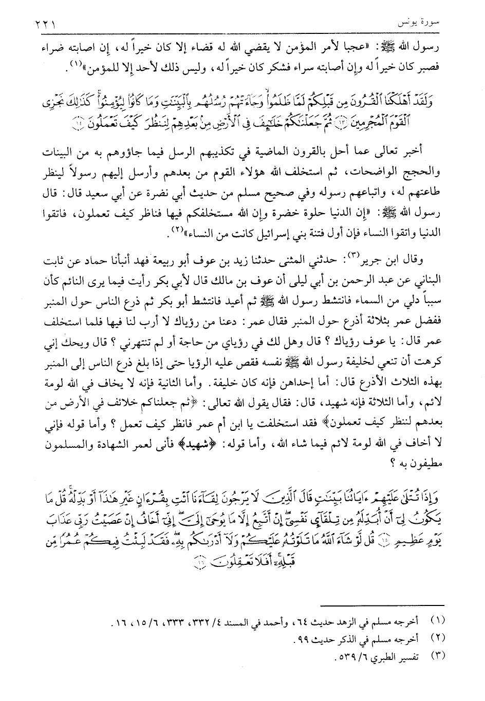 وَقَالَ ابْنُ جَرِيرٍ «3» : حَدَّثَنِي الْمُثَنَّى حَدَّثَنَا زيد بن عوف أبو ربيعة فهد أنبأنا حماد عَنْ ثَابِتٍ الْبُنَانِيِّ عَنْ عَبْدِ الرَّحْمَنِ بْنِ أَبِي لَيْلَى أَنَّ عَوْفَ بْنَ مَالِكٍ قَالَ لِأَبِي بَكْرٍ رَأَيْتُ فِيمَا يَرَى النَّائِمُ كَأَنَّ سَبَبًا دُلِّيَ مِنَ السَّمَاءِ فَانْتُشِطَ رَسُولُ اللَّهِ صَلَّى اللَّهُ عَلَيْهِ وَسَلَّمَ ثُمَّ أُعِيدَ فَانْتُشِطَ أَبُو بَكْرٍ ثُمَّ ذُرِعَ النَّاسُ حَوْلَ الْمِنْبَرِ ففضل عمر بثلاثة أذرع حول الْمِنْبَرِ فَقَالَ عُمَرُ: دَعْنَا مِنْ رُؤْيَاكَ لَا أَرَبَ لَنَا فِيهَا فَلَمَّا اسْتُخْلِفَ عُمَرُ قَالَ: يا عوف رؤياك؟ قال وهل لك في رؤياي من حاجة أو لم تنتهرني؟ قال وَيْحَكَ إِنِّي كَرِهْتُ أَنْ تَنْعَى لِخَلِيفَةِ رَسُولِ اللَّهِ صَلَّى اللَّهُ عَلَيْهِ وَسَلَّمَ نَفْسَهُ فَقَصَّ عَلَيْهِ الرُّؤْيَا حَتَّى إِذَا بَلَغَ ذُرِعَ النَّاسُ إِلَى الْمِنْبَرِ بِهَذِهِ الثَّلَاثِ الْأَذْرُعِ قَالَ: أَمَّا إحداهن فإنه كان خَلِيفَةً. وَأَمَّا الثَّانِيَةُ فَإِنَّهُ لَا يَخَافُ فِي الله لومة لائم، وأما الثلاثة فَإِنَّهُ شَهِيدٌ، قَالَ: فَقَالَ يَقُولُ اللَّهُ تَعَالَى: ثُمَّ جَعَلْناكُمْ خَلائِفَ فِي الْأَرْضِ مِنْ بَعْدِهِمْ لِنَنْظُرَ كَيْفَ تَعْمَلُونَ فَقَدِ اسْتُخْلِفْتَ يَا ابْنَ أُمِّ عُمَرَ فَانْظُرْ كَيْفَ تَعْمَلُ؟ وَأَمَّا قَوْلُهُ فَإِنِّي لَا أَخَافُ فِي اللَّهِ لَوْمَةَ لَائِمٍ فيما شاء الله، وأما قوله: شَهِيدٌ فَأَنَّى لِعُمَرَ الشَّهَادَةُ وَالْمُسْلِمُونَ مُطِيفُونَ بِهِ؟