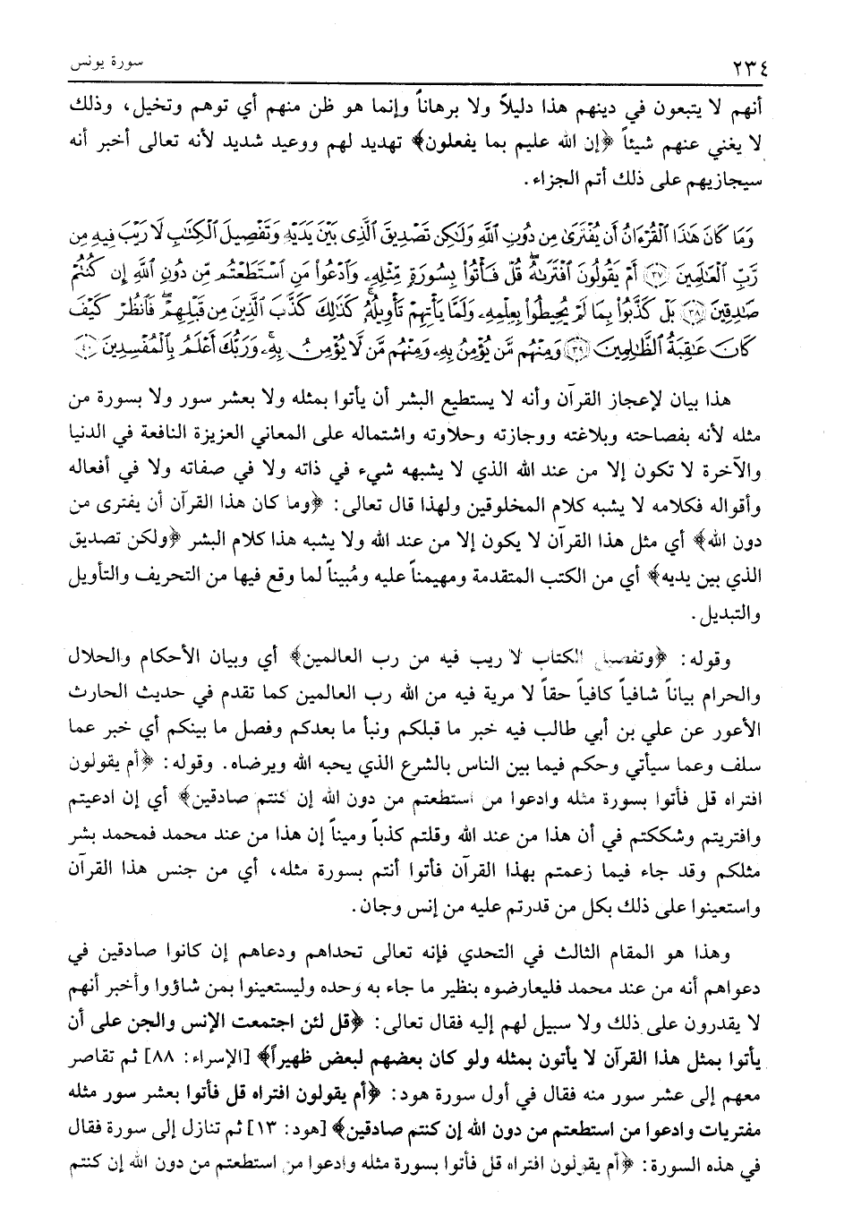 وَما كانَ هذَا الْقُرْآنُ أَنْ يُفْتَرى مِنْ دُونِ اللَّهِ وَلكِنْ تَصْدِيقَ الَّذِي بَيْنَ يَدَيْهِ وَتَفْصِيلَ الْكِتابِ لَا رَيْبَ فِيهِ مِنْ رَبِّ الْعالَمِينَ (37) أَمْ يَقُولُونَ افْتَراهُ قُلْ فَأْتُوا بِسُورَةٍ مِثْلِهِ وَادْعُوا مَنِ اسْتَطَعْتُمْ مِنْ دُونِ اللَّهِ إِنْ كُنْتُمْ صادِقِينَ (38) بَلْ كَذَّبُوا بِما لَمْ يُحِيطُوا بِعِلْمِهِ وَلَمَّا يَأْتِهِمْ تَأْوِيلُهُ كَذلِكَ كَذَّبَ الَّذِينَ مِنْ قَبْلِهِمْ فَانْظُرْ كَيْفَ كانَ عاقِبَةُ الظَّالِمِينَ (39) وَمِنْهُمْ مَنْ يُؤْمِنُ بِهِ وَمِنْهُمْ مَنْ لَا يُؤْمِنُ بِهِ وَرَبُّكَ أَعْلَمُ بِالْمُفْسِدِينَ (40)
