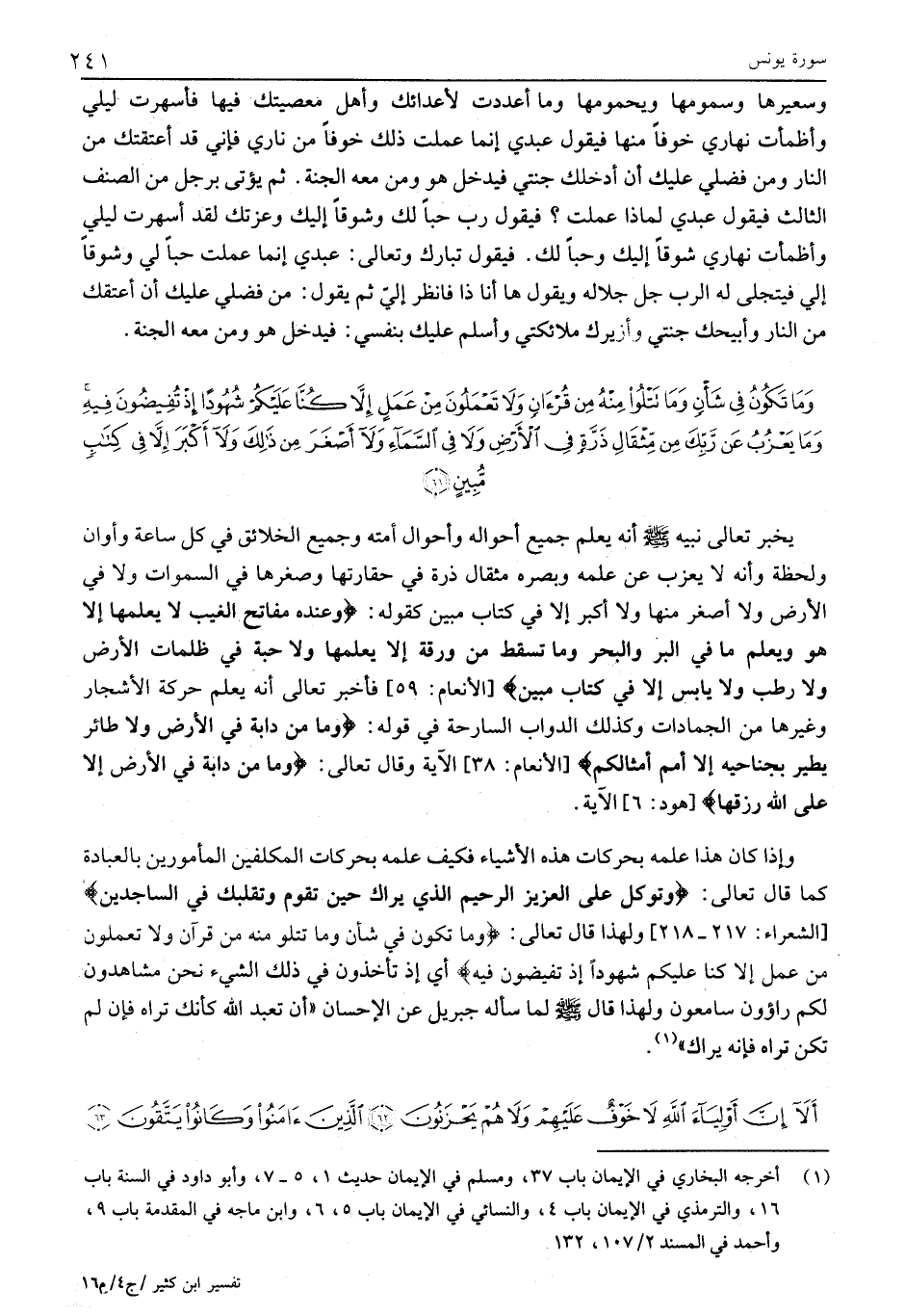 وَإِذَا كَانَ هَذَا عِلْمَهُ بِحَرَكَاتِ هَذِهِ الْأَشْيَاءِ فكيف علمه بِحَرَكَاتِ الْمُكَلَّفِينَ الْمَأْمُورِينَ بِالْعِبَادَةِ كَمَا قَالَ تَعَالَى: وَتَوَكَّلْ عَلَى الْعَزِيزِ الرَّحِيمِ الَّذِي يَراكَ حِينَ تَقُومُ وَتَقَلُّبَكَ فِي السَّاجِدِينَ [الشُّعَرَاءِ: 217- 218] وَلِهَذَا قَالَ تَعَالَى: وَما تَكُونُ فِي شَأْنٍ وَما تَتْلُوا مِنْهُ مِنْ قُرْآنٍ وَلا تَعْمَلُونَ مِنْ عَمَلٍ إِلَّا كُنَّا عَلَيْكُمْ شُهُوداً إِذْ تُفِيضُونَ فِيهِ أي إذا تَأْخُذُونَ فِي ذَلِكَ الشَّيْءِ نَحْنُ مُشَاهِدُونَ لَكُمْ راؤون سامعون ولهذا قال صلى الله عليه وسلم لما سأله جبريل عَنِ الْإِحْسَانُ «أَنْ تَعْبُدَ اللَّهَ كَأَنَّكَ تَرَاهُ فَإِنْ لَمْ تَكُنْ تَرَاهُ فإنه يراك» «1» .