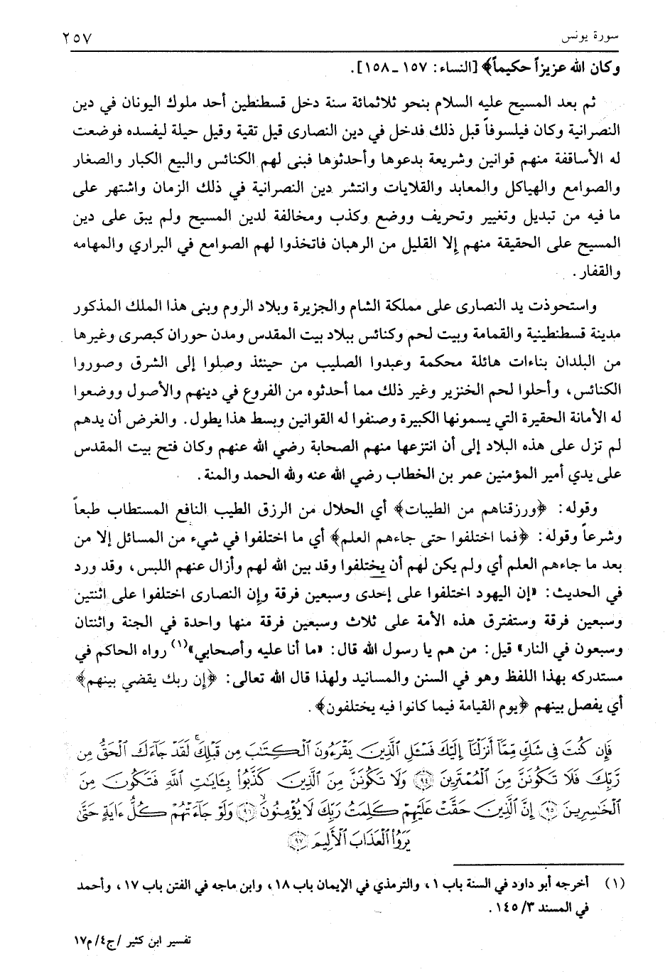 وَقَوْلُهُ: وَرَزَقْناهُمْ مِنَ الطَّيِّباتِ أَيْ الْحَلَالِ مِنَ الرِّزْقِ الطَّيِّبِ النَّافِعِ الْمُسْتَطَابِ طَبْعًا وَشَرْعًا وَقَوْلُهُ: فَمَا اخْتَلَفُوا حَتَّى جاءَهُمُ الْعِلْمُ أَيْ مَا اخْتَلَفُوا فِي شَيْءٍ مِنَ الْمَسَائِلِ إِلَّا مِنْ بَعْدِ مَا جَاءَهُمُ الْعِلْمُ أَيْ وَلَمْ يَكُنْ لَهُمْ أَنْ يَخْتَلِفُوا وَقَدْ بَيَّنَ اللَّهُ لَهُمْ وَأَزَالَ عَنْهُمُ اللَّبْسَ، وَقَدْ وَرَدَ فِي الْحَدِيثِ: «أَنَّ الْيَهُودَ اخْتَلَفُوا عَلَى إِحْدَى وَسَبْعِينَ فِرْقَةً وَأَنَّ النَّصَارَى اخْتَلَفُوا عَلَى اثْنَتَيْنِ وَسَبْعِينَ فِرْقَةً وَسَتَفْتَرِقُ هَذِهِ الْأُمَّةُ عَلَى ثَلَاثٍ وَسَبْعِينَ فِرْقَةً منها واحدة في الجنة واثنتان وَسَبْعُونَ فِي النَّارِ» قِيلَ: مَنْ هُمْ يَا رَسُولَ اللَّهِ قَالَ: «مَا أَنَا عَلَيْهِ وَأَصْحَابِي» «1» رَوَاهُ الْحَاكِمُ فِي مُسْتَدْرَكِهِ بِهَذَا اللَّفْظِ وَهُوَ فِي السُّنَنِ وَالْمَسَانِيدِ وَلِهَذَا قَالَ اللَّهُ تَعَالَى: إِنَّ رَبَّكَ يَقْضِي بَيْنَهُمْ أَيْ يَفْصِلُ بَيْنَهُمْ يَوْمَ الْقِيامَةِ فِيما كانُوا فِيهِ يَخْتَلِفُونَ.