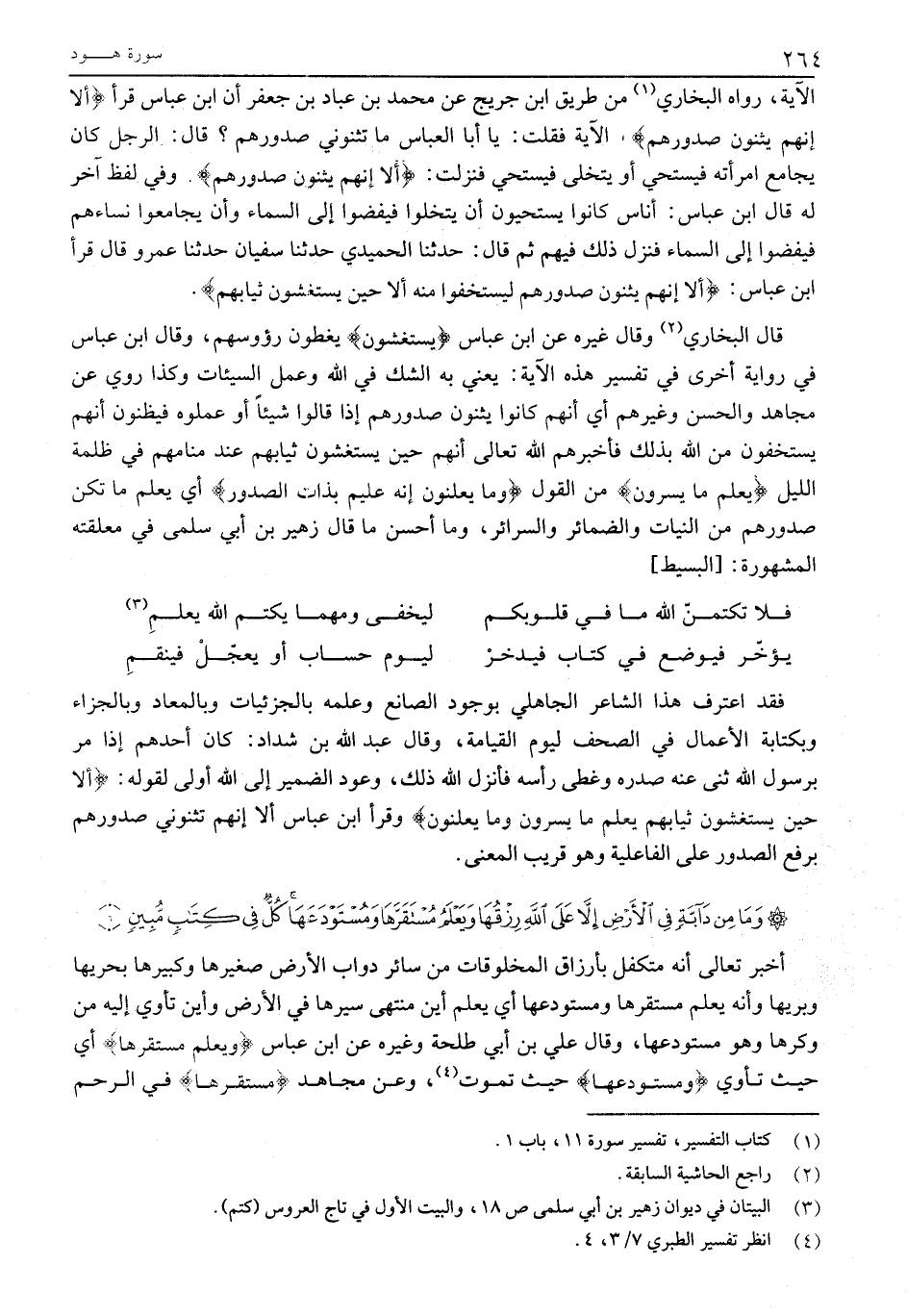 قَالَ الْبُخَارِيُّ «2» وَقَالَ غَيْرُهُ عن ابن عباس يَسْتَغْشُونَ يغطون رؤوسهم، وَقَالَ ابْنُ عَبَّاسٍ فِي رِوَايَةٍ أُخْرَى فِي تَفْسِيرِ هَذِهِ الْآيَةِ: يَعْنِي بِهِ الشَّكَّ فِي اللَّهِ وَعَمَلَ السَّيِّئَاتِ وَكَذَا رُوِيَ عَنْ مُجَاهِدٍ وَالْحَسَنِ وَغَيْرِهِمْ أَيْ أَنَّهُمْ كَانُوا يَثْنُونَ صُدُورَهُمْ إذا قالوا شيئا أو عملوه فيظنون أنهم يستخفون من الله بذلك فأخبرهم اللَّهُ تَعَالَى أَنَّهُمْ حِينَ يَسْتَغْشُونَ ثِيَابَهُمْ عِنْدَ مَنَامِهِمْ فِي ظُلْمَةِ اللَّيْلِ يَعْلَمُ مَا يُسِرُّونَ مِنَ الْقَوْلِ وَما يُعْلِنُونَ إِنَّهُ عَلِيمٌ بِذاتِ الصُّدُورِ أَيْ يَعْلَمُ مَا تُكِنُّ صُدُورُهُمْ مِنَ النِّيَّاتِ وَالضَّمَائِرِ وَالسَّرَائِرِ، وَمَا أَحْسَنَ مَا قَالَ زُهَيْرُ بْنُ أَبِي سُلْمَى فِي مُعَلَّقَتِهِ الْمَشْهُورَةِ: [البسيط]