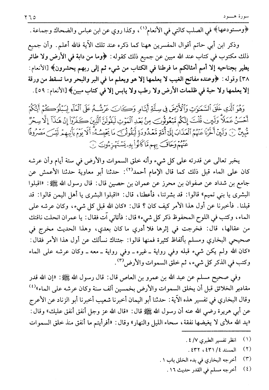 وَفِي صَحِيحِ مُسْلِمٍ عَنْ عَبْدِ اللَّهِ بْنِ عَمْرِو بْنِ الْعَاصِ قَالَ: قَالَ رَسُولُ اللَّهِ صَلَّى اللَّهُ عَلَيْهِ وَسَلَّمَ: «إِنَّ اللَّهَ قَدَّرَ مَقَادِيرَ الْخَلَائِقِ قَبْلَ أَنْ يَخْلُقَ السَّمَوَاتِ وَالْأَرْضَ بِخَمْسِينَ أَلْفَ سَنَةٍ وَكَانَ عَرْشُهُ عَلَى الْمَاءِ» «4» وَقَالَ الْبُخَارِيُّ فِي تَفْسِيرِ هَذِهِ الْآيَةِ: حَدَّثَنَا أَبُو الْيَمَانِ أَخْبَرَنَا شُعَيْبٌ أَخْبَرَنَا أَبُو الزِّنَادِ عَنِ الْأَعْرَجِ عَنْ أَبِي هُرَيْرَةَ رَضِيَ اللَّهُ عَنْهُ أَنَّ رَسُولَ اللَّهِ صَلَّى اللَّهُ عَلَيْهِ وَسَلَّمَ قَالَ: «قَالَ اللَّهُ عَزَّ وَجَلَّ أَنْفِقْ أُنْفِقْ عَلَيْكَ» وَقَالَ: