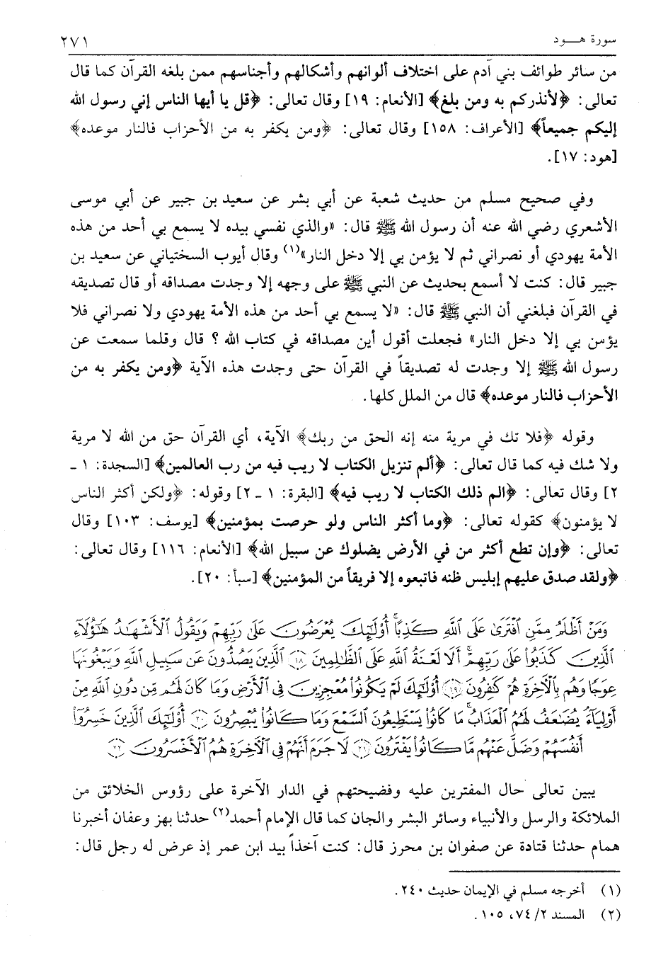 وَفِي صَحِيحِ مُسْلِمٍ مِنْ حَدِيثِ شُعْبَةَ عَنْ أَبِي بِشْرٍ عَنْ سَعِيدِ بْنِ جُبَيْرٍ عَنْ أَبِي مُوسَى الْأَشْعَرِيِّ رَضِيَ اللَّهُ عَنْهُ أَنَّ رَسُولَ اللَّهِ صَلَّى اللَّهُ عَلَيْهِ وسلم قَالَ: «وَالَّذِي نَفْسِي بِيَدِهِ لَا يَسْمَعُ بِي أَحَدٌ مِنْ هَذِهِ الْأُمَّةِ يَهُودِيٌّ أَوْ نَصْرَانِيٌّ ثُمَّ لَا يُؤْمِنُ بِي إِلَّا دَخَلَ النَّارَ» «1» وَقَالَ أَيُّوبُ السِّخْتِيَانِيُّ عَنْ سَعِيدِ بْنِ جُبَيْرٍ قَالَ: كنت لا أسمع بحديث عن النبي صَلَّى اللَّهُ عَلَيْهِ وَسَلَّمَ عَلَى وَجْهِهِ إِلَّا وَجَدْتُ مِصْدَاقَهُ أَوْ قَالَ تَصْدِيقَهُ فِي الْقُرْآنِ فبلغني أَنَّ النَّبِيَّ صَلَّى اللَّهُ عَلَيْهِ وَسَلَّمَ قَالَ: «لَا يَسْمَعُ بِي أَحَدٌ مِنْ هَذِهِ الْأُمَّةِ يَهُودِيٌّ وَلَا نَصْرَانِيٌّ فَلَا يُؤْمِنُ بِي إِلَّا دَخَلَ النَّارَ» فَجَعَلْتُ أَقُولُ أَيْنَ مِصْدَاقُهُ فِي كِتَابِ اللَّهِ؟ قَالَ وَقَلَّمَا سَمِعْتُ عَنْ رَسُولِ اللَّهِ صَلَّى اللَّهُ عَلَيْهِ وَسَلَّمَ إِلَّا وَجَدْتُ لَهُ تَصْدِيقًا فِي الْقُرْآنِ حَتَّى وَجَدْتُ هَذِهِ الْآيَةَ وَمَنْ يَكْفُرْ بِهِ مِنَ الْأَحْزابِ فَالنَّارُ مَوْعِدُهُ قال من الملل كلها.