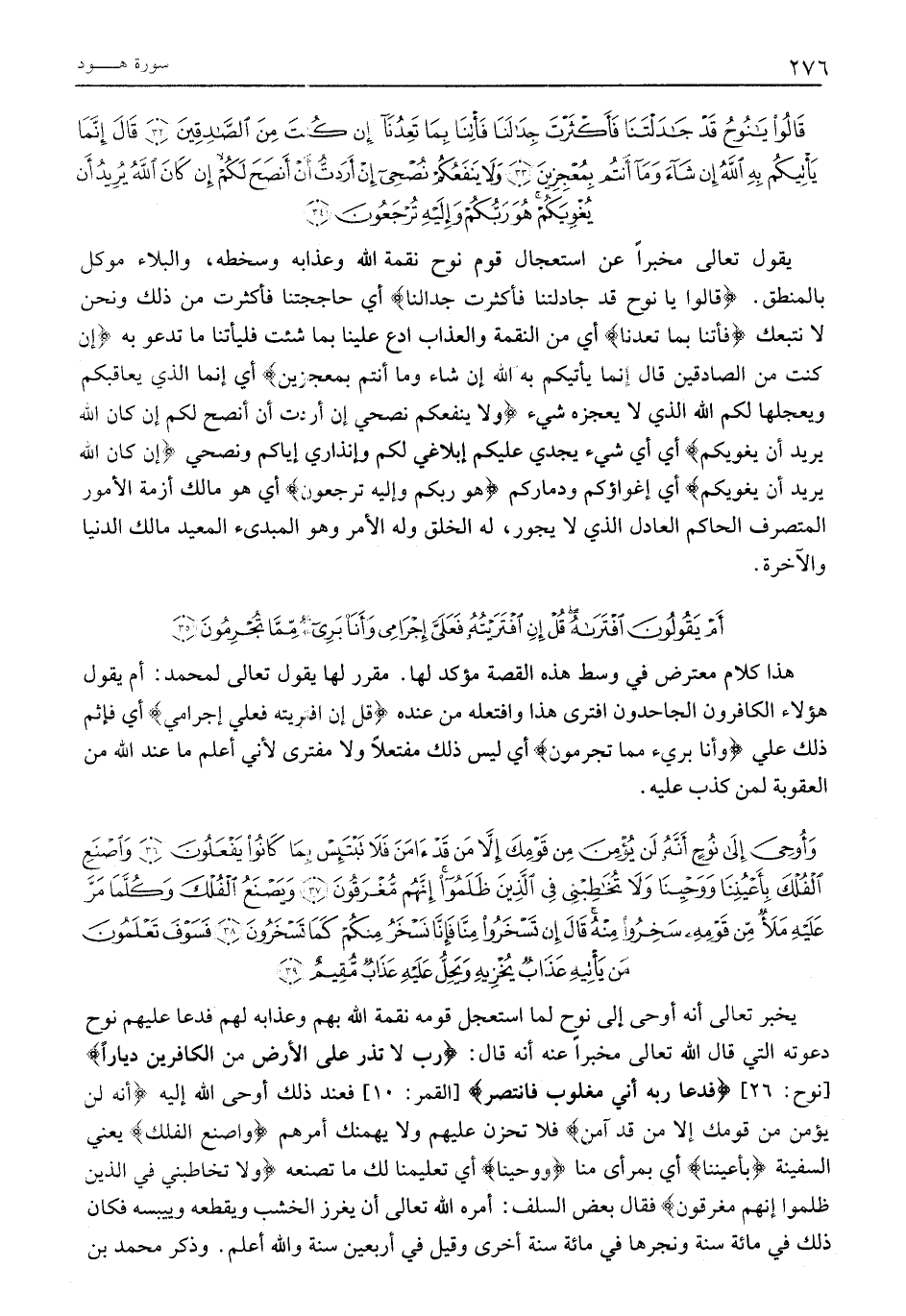 يَقُولُ تَعَالَى مُخْبِرًا عَنِ اسْتِعْجَالِ قَوْمِ نُوحٍ نِقْمَةَ اللَّهِ وَعَذَابَهُ وَسُخْطَهُ، وَالْبَلَاءُ مُوَكَّلٌ بِالْمَنْطِقِ. قالُوا يَا نُوحُ قَدْ جادَلْتَنا فَأَكْثَرْتَ جِدالَنا أَيْ حَاجَجْتَنَا فَأَكْثَرَتْ مِنْ ذَلِكَ وَنَحْنُ لَا نَتَبِّعُكَ فَأْتِنا بِما تَعِدُنا أَيْ مِنَ النِّقْمَةِ وَالْعَذَابِ ادْعُ عَلَيْنَا بِمَا شِئْتَ فَلْيَأْتِنَا مَا تَدْعُو بِهِ إِنْ كُنْتَ مِنَ الصَّادِقِينَ قالَ إِنَّما يَأْتِيكُمْ بِهِ اللَّهُ إِنْ شاءَ وَما أَنْتُمْ بِمُعْجِزِينَ أَيْ إِنَّمَا الَّذِي يُعَاقِبُكُمْ وَيُعَجِّلُهَا لَكُمُ اللَّهُ الَّذِي لَا يُعْجِزُهُ شَيْءٌ وَلا يَنْفَعُكُمْ نُصْحِي إِنْ أَرَدْتُ أَنْ أَنْصَحَ لَكُمْ إِنْ كانَ اللَّهُ يُرِيدُ أَنْ يُغْوِيَكُمْ أَيْ أَيُّ شَيْءٍ يُجْدِي عَلَيْكُمْ إِبْلَاغِي لَكُمْ وَإِنْذَارِي إياكم ونصحي إِنْ كانَ اللَّهُ يُرِيدُ أَنْ يُغْوِيَكُمْ أَيْ إغواؤكم وَدَمَارَكُمْ هُوَ رَبُّكُمْ وَإِلَيْهِ تُرْجَعُونَ أَيْ هُوَ مالك أزمة الأمور المتصرف الْحَاكِمُ الْعَادِلُ الَّذِي لَا يَجُورُ، لَهُ الْخَلْقُ وَلَهُ الْأَمْرُ وَهُوَ الْمُبْدِئُ الْمُعِيدُ مَالِكُ الدُّنْيَا والآخرة.
