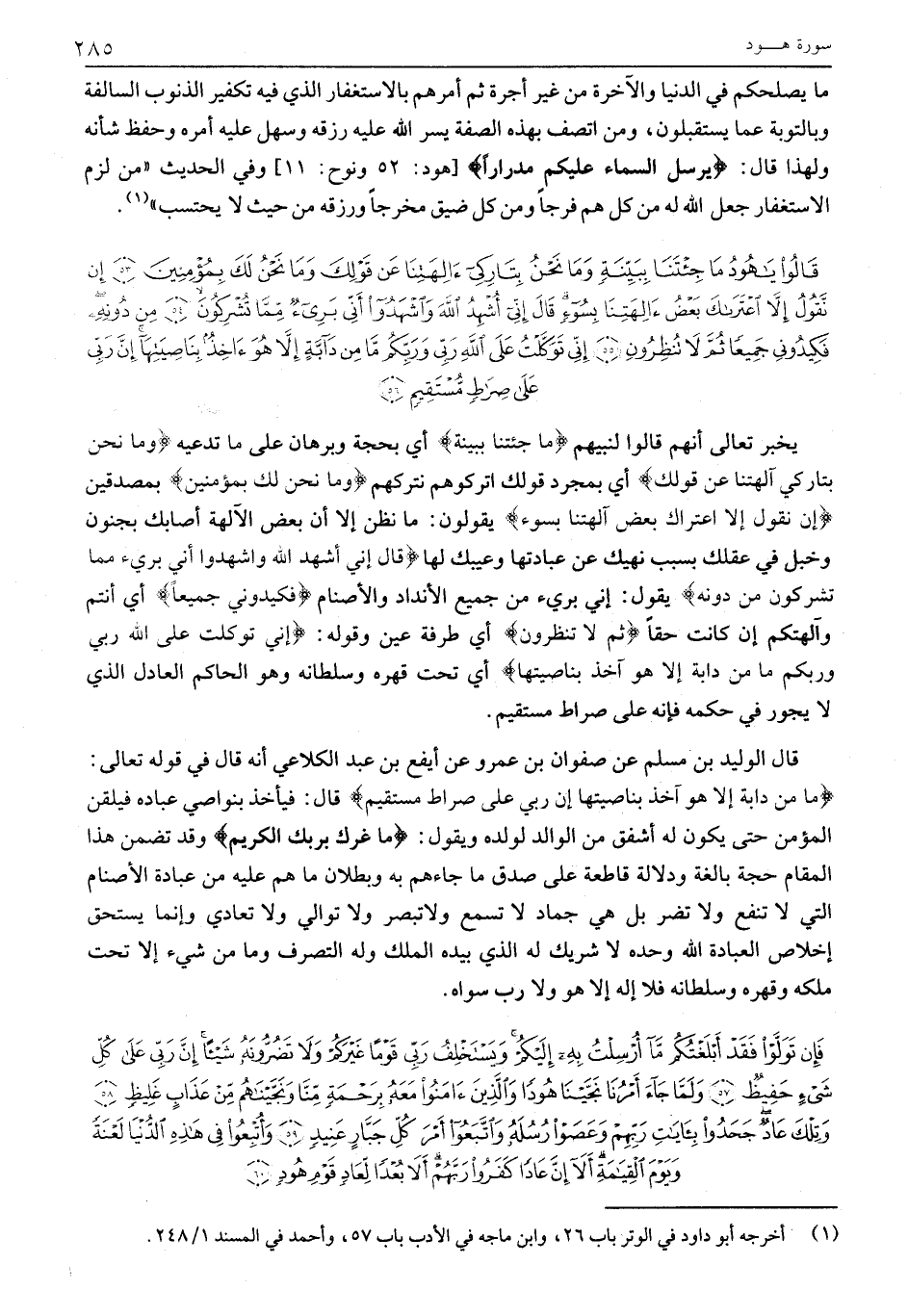 قالُوا يَا هُودُ مَا جِئْتَنا بِبَيِّنَةٍ وَما نَحْنُ بِتارِكِي آلِهَتِنا عَنْ قَوْلِكَ وَما نَحْنُ لَكَ بِمُؤْمِنِينَ (53) إِنْ نَقُولُ إِلاَّ اعْتَراكَ بَعْضُ آلِهَتِنا بِسُوءٍ قالَ إِنِّي أُشْهِدُ اللَّهَ وَاشْهَدُوا أَنِّي بَرِيءٌ مِمَّا تُشْرِكُونَ (54) مِنْ دُونِهِ فَكِيدُونِي جَمِيعاً ثُمَّ لَا تُنْظِرُونِ (55) إِنِّي تَوَكَّلْتُ عَلَى اللَّهِ رَبِّي وَرَبِّكُمْ مَا مِنْ دَابَّةٍ إِلاَّ هُوَ آخِذٌ بِناصِيَتِها إِنَّ رَبِّي عَلى صِراطٍ مُسْتَقِيمٍ (56)
