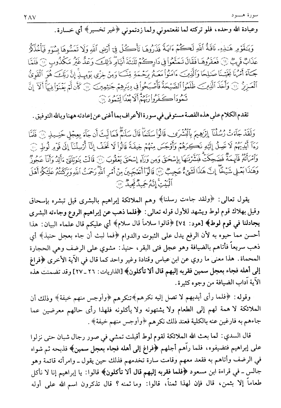 قَالَ السُّدِّيُّ: لَمَّا بَعَثَ اللَّهُ الْمَلَائِكَةَ لِقَوْمِ لُوطٍ أَقْبَلَتْ تَمْشِي فِي صُوَرِ رِجَالٍ شُبَّانٍ حَتَّى نَزَلُوا على إبراهيم فتضيفوه، فلما رآهم أَجَلَّهُمْ فَراغَ إِلى أَهْلِهِ فَجاءَ بِعِجْلٍ سَمِينٍ فذبحه ثم شواه في الرضف وَأَتَاهُمْ بِهِ فَقَعَدَ مَعَهُمْ وَقَامَتْ سَارَّةُ تَخْدِمُهُمْ فَذَلِكَ حِينَ يَقُولُ- وَاِمْرَأَتُهُ قَائِمَةٌ وَهُوَ جَالِسٌ- في قراءة ابن مسعود فلما فقربه إِلَيْهِمْ قالَ أَلا تَأْكُلُونَ قَالُوا: يَا إِبْرَاهِيمُ إِنَّا لَا نَأْكُلُ طَعَامًا إِلَّا بِثَمَنٍ، قَالَ فَإِنَّ لِهَذَا ثَمَنًا، قَالُوا: وَمَا ثَمَنُهُ؟ قَالَ تَذْكُرُونَ اسْمَ اللَّهِ عَلَى أَوَّلِهِ
