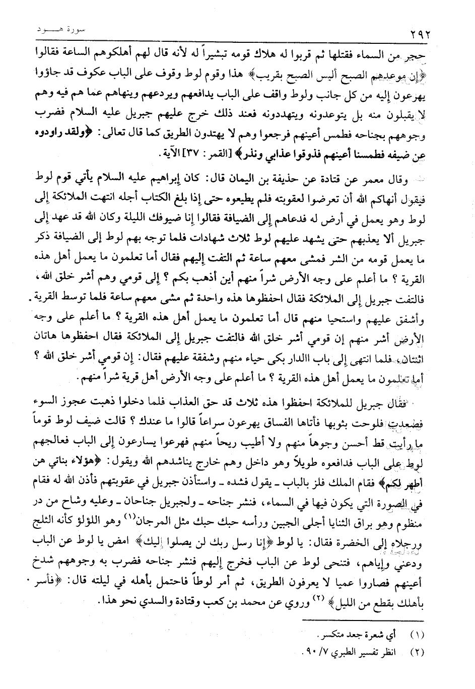 فَقَالَ جِبْرِيلُ لِلْمَلَائِكَةِ احْفَظُوا هَذِهِ ثَلَاثٌ قَدْ حَقَّ الْعَذَابُ فَلَمَّا دَخَلُوا ذَهَبَتْ عَجُوزُ السُّوءِ فَصَعِدَتْ فَلَوَّحَتْ بِثَوْبِهَا فَأَتَاهَا الْفُسَّاقُ يُهْرَعُونَ سِرَاعًا قَالُوا مَا عِنْدَكِ؟ قَالَتْ ضَيَّفَ لُوطٌ قَوْمًا مَا رَأَيْتُ قَطُّ أَحْسَنَ وُجُوهًا مِنْهُمْ وَلَا أَطْيَبَ رِيحًا مِنْهُمْ فَهُرِعُوا يُسَارِعُونَ إِلَى الْبَابِ فَعَالَجَهُمْ لُوطٌ عَلَى الباب فدافعوه طويلا وهو دَاخِلُ وَهُمْ خَارِجَ يُنَاشِدُهُمُ اللَّهَ وَيَقُولُ: هؤُلاءِ بَناتِي هُنَّ أَطْهَرُ لَكُمْ فَقَامَ الْمَلَكُ فَلَزَّ بالباب- يقول فشده- وَاسْتَأْذَنَ جِبْرِيلُ فِي عُقُوبَتِهِمْ فَأَذِنَ اللَّهُ لَهُ فَقَامَ فِي الصُّورَةِ الَّتِي يَكُونُ فِيهَا فِي السَّمَاءِ، فَنَشَرَ جَنَاحَهُ- وَلِجِبْرِيلَ جَنَاحَانِ- وَعَلَيْهِ وِشَاحٌ مِنْ دُرٍّ مَنْظُومٍ وَهُوَ بَرَّاقُ الثَّنَايَا أَجْلَى الْجَبِينِ وَرَأْسُهُ حُبُكٌ حُبُكٌ مِثْلَ الْمَرْجَانِ «1» وَهُوَ اللُّؤْلُؤُ كَأَنَّهُ الثَّلْجُ وَرِجْلَاهُ إِلَى الْخُضْرَةِ فَقَالَ: يَا لُوطُ إِنَّا رُسُلُ رَبِّكَ لَنْ يَصِلُوا إِلَيْكَ امْضِ يَا لُوطُ عَنِ الْبَابِ وَدَعْنِي وَإِيَّاهُمْ، فَتَنَحَّى لُوطٌ عَنِ الْبَابِ فَخَرَجَ إِلَيْهِمْ فنشر جناحه فضرب به وجوههم شَدَخَ أَعْيُنَهُمْ فَصَارُوا عُمْيًا لَا يَعْرِفُونَ الطَّرِيقَ، ثم أمر لوطا فَاحْتَمَلَ بِأَهْلِهِ فِي لَيْلَتِهِ قَالَ: فَأَسْرِ بِأَهْلِكَ بِقِطْعٍ مِنَ اللَّيْلِ «2» وَرُوِيَ عَنْ مُحَمَّدِ بْنِ كعب وقتادة والسدي نحو هذا.