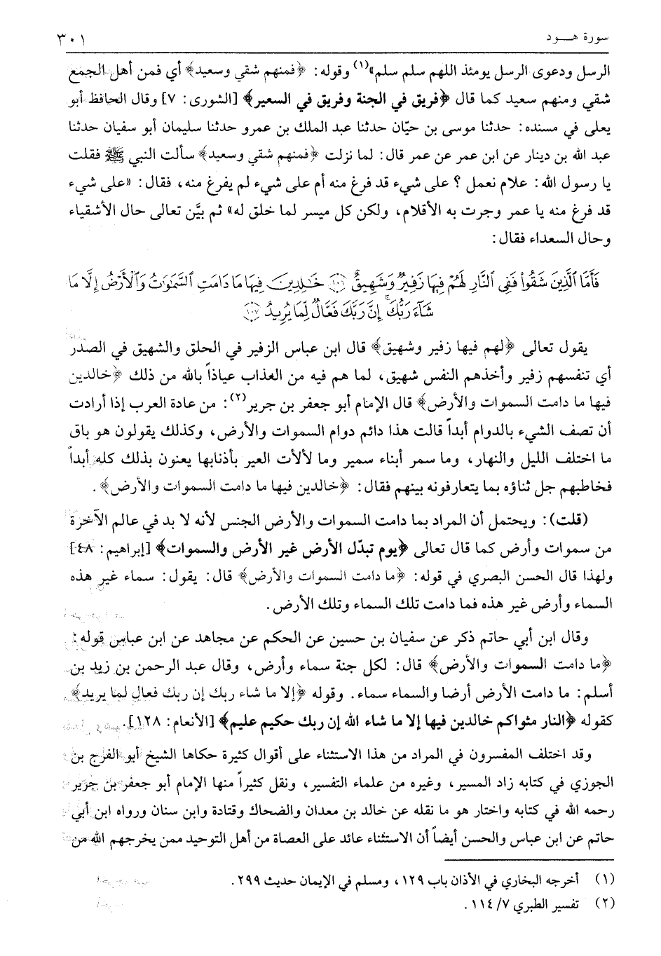 وَقَدِ اخْتَلَفَ الْمُفَسِّرُونَ فِي الْمُرَادِ مِنْ هَذَا الِاسْتِثْنَاءِ عَلَى أَقْوَالٍ كَثِيرَةٍ حَكَاهَا الشَّيْخُ أَبُو الْفَرَجِ بْنُ الْجَوْزِيِّ فِي كِتَابِهِ زَادُ الْمَسِيرِ، وَغَيْرُهُ مِنْ عُلَمَاءِ التَّفْسِيرِ، وَنَقَلَ كَثِيرًا مِنْهَا الْإِمَامُ أَبُو جَعْفَرِ بْنُ جَرِيرٍ رَحِمَهُ اللَّهُ فِي كِتَابِهِ وَاخْتَارَ هُوَ مَا نَقَلَهُ عَنْ خَالِدِ بن معدان والضحاك وقتادة وابن سِنَانٍ وَرَوَاهُ ابْنُ أَبِي حَاتِمٍ عَنِ ابْنِ عَبَّاسٍ وَالْحَسَنِ أَيْضًا أَنَّ الِاسْتِثْنَاءَ عَائِدٌ عَلَى الْعُصَاةِ مِنْ أَهْلِ التَّوْحِيدِ مِمَّنْ يُخْرِجُهُمُ اللَّهُ من