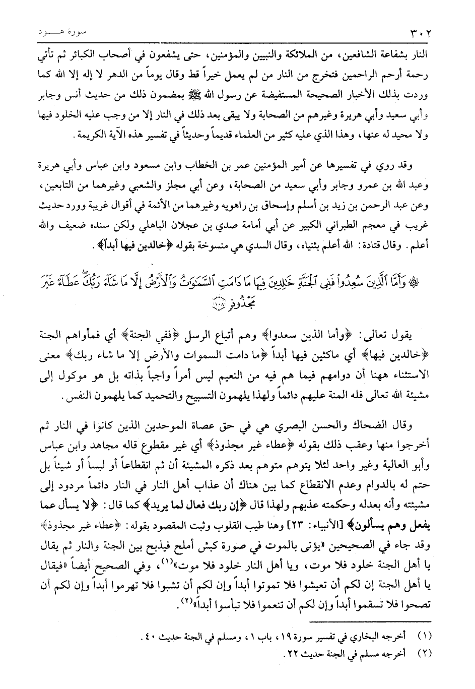 وَأَمَّا الَّذِينَ سُعِدُوا فَفِي الْجَنَّةِ خالِدِينَ فِيها مَا دامَتِ السَّماواتُ وَالْأَرْضُ إِلاَّ مَا شاءَ رَبُّكَ عَطاءً غَيْرَ مَجْذُوذٍ (108)