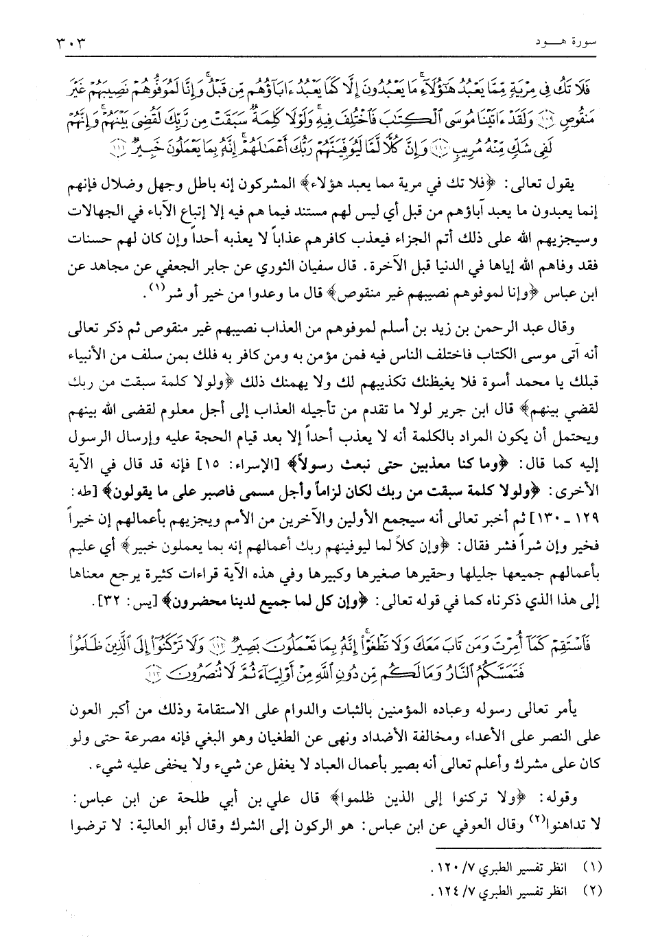 فَلا تَكُ فِي مِرْيَةٍ مِمَّا يَعْبُدُ هؤُلاءِ مَا يَعْبُدُونَ إِلاَّ كَما يَعْبُدُ آباؤُهُمْ مِنْ قَبْلُ وَإِنَّا لَمُوَفُّوهُمْ نَصِيبَهُمْ غَيْرَ مَنْقُوصٍ (109) وَلَقَدْ آتَيْنا مُوسَى الْكِتابَ فَاخْتُلِفَ فِيهِ وَلَوْلا كَلِمَةٌ سَبَقَتْ مِنْ رَبِّكَ لَقُضِيَ بَيْنَهُمْ وَإِنَّهُمْ لَفِي شَكٍّ مِنْهُ مُرِيبٍ (110) وَإِنَّ كُلاًّ لَمَّا لَيُوَفِّيَنَّهُمْ رَبُّكَ أَعْمالَهُمْ إِنَّهُ بِما يَعْمَلُونَ خَبِيرٌ (111)