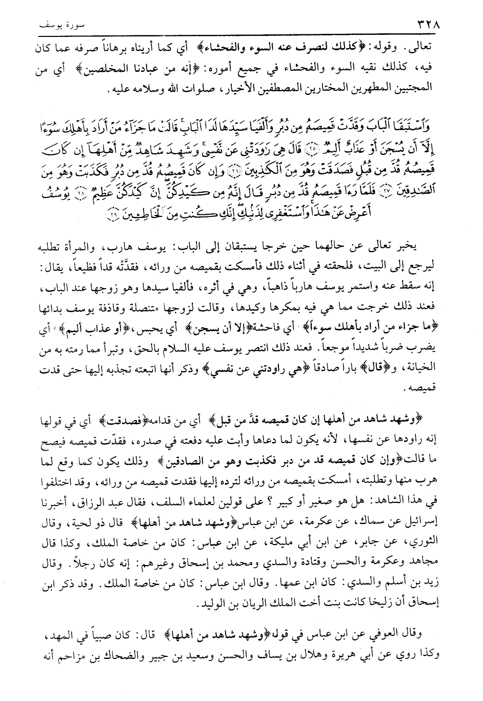 إِنَّهُ سَقَطَ عَنْهُ وَاسْتَمَرَّ يُوسُفُ هَارِبًا ذَاهِبًا، وَهِيَ فِي إِثْرِهِ، فَأَلْفَيَا سَيِّدَهَا وَهُوَ زَوْجُهَا عِنْدَ الْبَابِ، فَعِنْدَ ذَلِكَ خَرَجَتْ مِمَّا هِيَ فِيهِ بِمَكْرِهَا وَكَيْدِهَا، وَقَالَتْ لِزَوْجِهَا مُتَنَصِّلَةً وَقَاذِفَةً يُوسُفَ بَدَائَهَا مَا جَزاءُ مَنْ أَرادَ بِأَهْلِكَ سُوءاً أَيْ فَاحِشَةً إِلَّا أَنْ يُسْجَنَ أَيْ يُحْبَسَ، أَوْ عَذابٌ أَلِيمٌ أَيْ يُضْرَبَ ضَرْبًا شَدِيدًا مُوجِعًا. فَعِنْدَ ذَلِكَ انْتَصَرَ يُوسُفُ عَلَيْهِ السَّلَامُ بِالْحَقِّ، وَتَبْرَّأَ مِمَّا رَمَتْهُ بِهِ مِنَ الْخِيَانَةِ، وقالَ بَارًّا صَادِقًا هِيَ راوَدَتْنِي عَنْ نَفْسِي وَذَكَرَ أَنَّهَا اتَّبَعَتْهُ تَجْذِبُهُ إِلَيْهَا حَتَّى قَدَّتْ قَمِيصَهُ.
