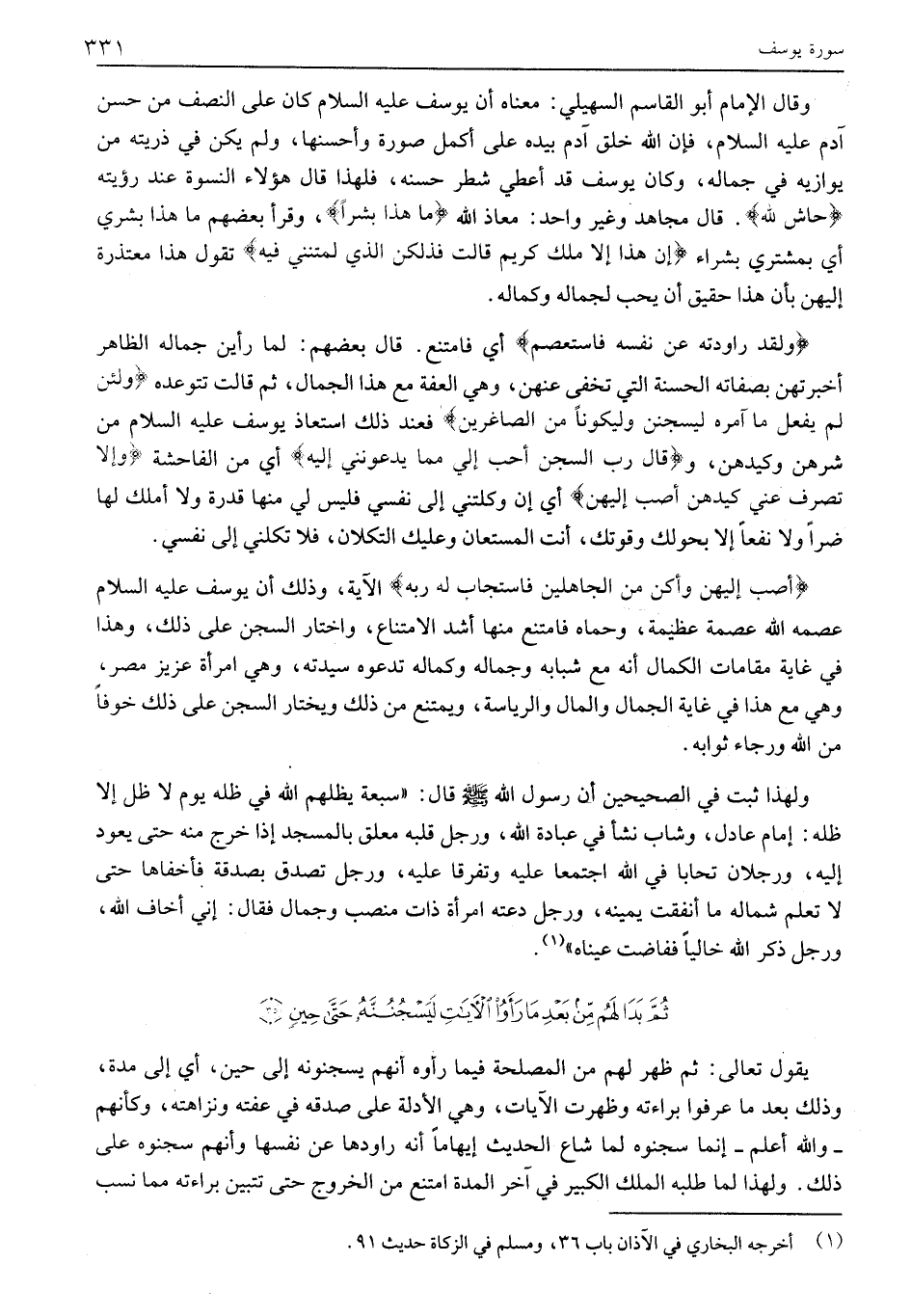 أَصْبُ إِلَيْهِنَّ وَأَكُنْ مِنَ الْجاهِلِينَ فَاسْتَجابَ لَهُ رَبُّهُ الآية، وَذَلِكَ أَنَّ يُوسُفَ عَلَيْهِ السَّلَامُ عَصَمَهُ اللَّهُ عِصْمَةً عَظِيمَةً، وَحَمَاهُ فَامْتَنَعَ مِنْهَا أَشَدَّ الِامْتِنَاعِ، وَاخْتَارَ السِّجْنَ عَلَى ذَلِكَ، وَهَذَا فِي غَايَةِ مَقَامَاتِ الْكَمَالِ أَنَّهُ مَعَ شَبَابِهِ وَجَمَالِهِ وَكَمَالِهِ تَدْعُوهُ سَيِّدَتُهُ، وَهِيَ امْرَأَةُ عَزِيزِ مِصْرَ، وَهِيَ مَعَ هَذَا فِي غَايَةِ الْجَمَالِ وَالْمَالِ وَالرِّيَاسَةِ، وَيَمْتَنِعُ مِنْ ذَلِكَ وَيَخْتَارُ السِّجْنَ عَلَى ذَلِكَ خَوْفًا مِنَ اللَّهِ وَرَجَاءَ ثَوَابِهِ.