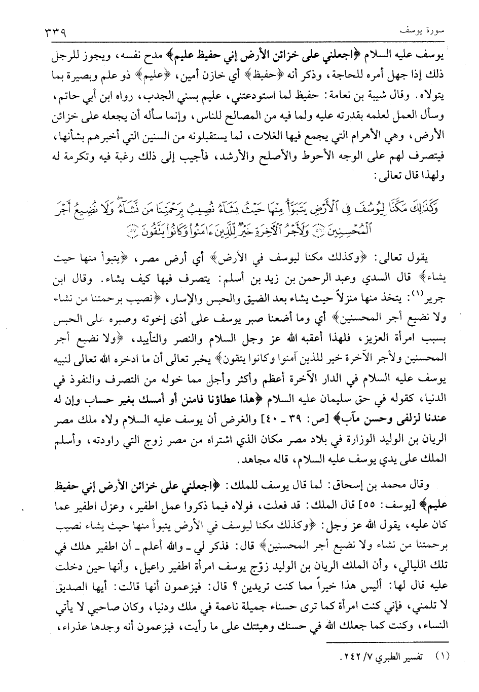 يُوسُفُ عَلَيْهِ السَّلَامُ اجْعَلْنِي عَلى خَزائِنِ الْأَرْضِ إِنِّي حَفِيظٌ عَلِيمٌ مَدَحَ نَفْسَهُ، وَيَجُوزُ لِلرَّجُلِ ذَلِكَ إِذَا جُهِلَ أَمْرُهُ لِلْحَاجَةِ، وَذَكَرَ أَنَّهُ حَفِيظٌ أَيْ خَازِنٌ أَمِينٌ، عَلِيمٌ ذُو عِلْمٍ وبصيرة بما يتولاه. وقال شَيْبَةُ بْنُ نَعَامَةَ: حَفِيظٌ لِمَا اسْتَوْدَعَتْنِي، عَلِيمٌ بِسِنِيِّ الْجَدْبِ، رَوَاهُ ابْنُ أَبِي حَاتِمٍ، وَسَأَلَ العمل لعلمه بقدرته عليه ولما فيه من المصالح للناس، وإنما سأله أن يجعله عَلَى خَزَائِنِ الْأَرْضِ، وَهِيَ الْأَهْرَامُ الَّتِي يُجْمَعُ فِيهَا الْغَلَّاتُ، لِمَا يَسْتَقْبِلُونَهُ مِنَ السِّنِينَ الَّتِي أخبرهم بشأنها، فيتصرف لَهُمْ عَلَى الْوَجْهِ الْأَحْوَطِ وَالْأَصْلَحِ وَالْأَرْشَدِ، فَأُجِيبَ إِلَى ذَلِكَ رَغْبَةً فِيهِ وَتَكْرِمَةً لَهُ وَلِهَذَا قال تعالى: