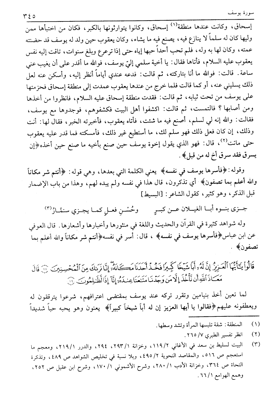 وَلَهُ شَوَاهِدُ كَثِيرَةٌ فِي الْقُرْآنِ وَالْحَدِيثِ وَاللُّغَةِ فِي مَنْثُورِهَا وَأَخْبَارِهَا وَأَشْعَارِهَا. قَالَ الْعَوْفِيُّ عَنِ ابْنِ عَبَّاسٍ فَأَسَرَّها يُوسُفُ فِي نَفْسِهِ، قَالَ: أَسَرَ فِي نَفْسِهِ أَنْتُمْ شَرٌّ مَكاناً وَاللَّهُ أَعْلَمُ بِما تَصِفُونَ.