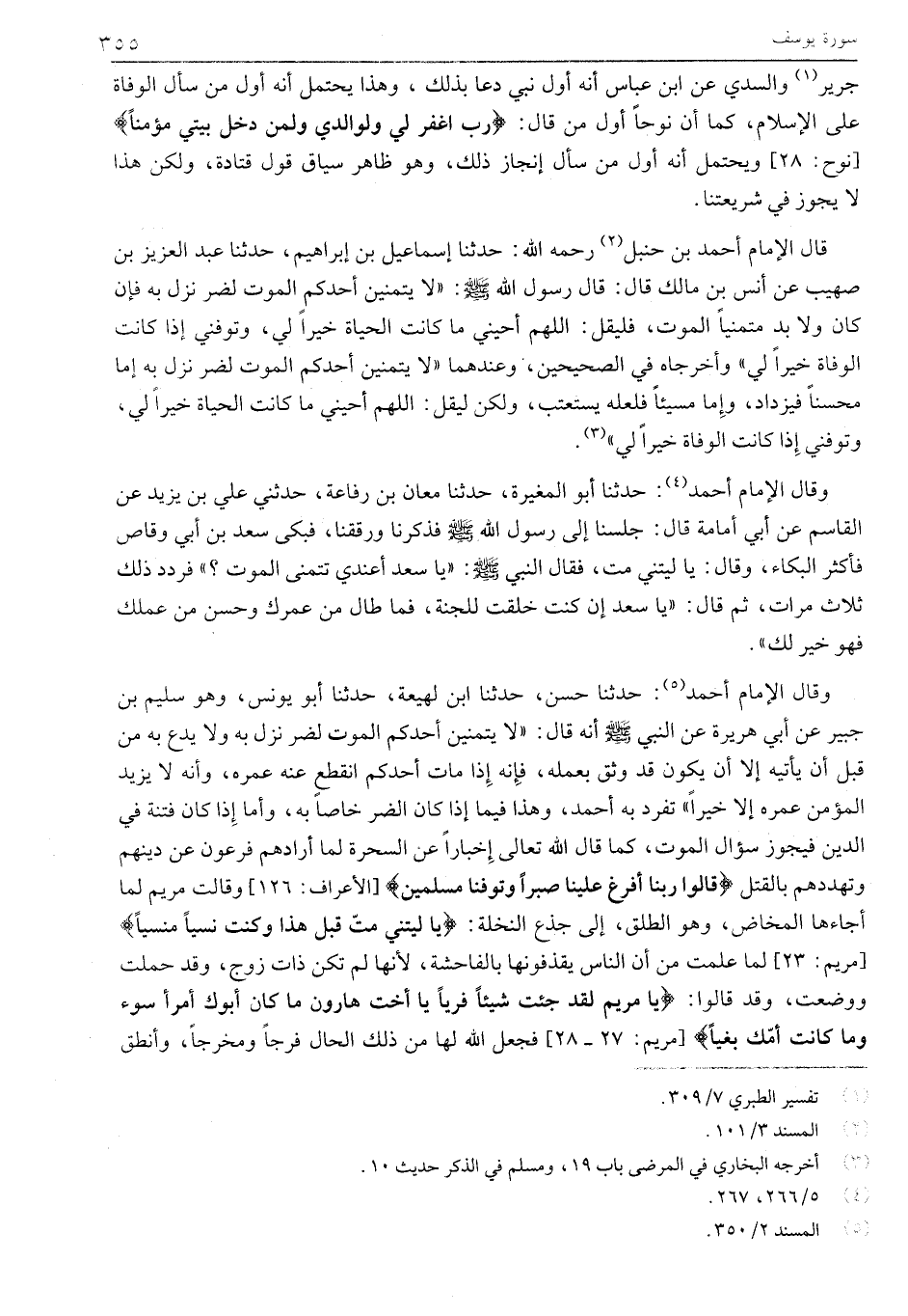 وَقَالَ الْإِمَامُ أَحْمَدُ «5» : حَدَّثَنَا حَسَنٌ، حَدَّثَنَا ابْنُ لَهِيعَةَ، حَدَّثَنَا أَبُو يُونُسَ، وَهُوَ سُلَيْمُ بْنُ جُبَيْرٍ عَنْ أَبِي هُرَيْرَةَ عَنِ النَّبِيِّ صَلَّى اللَّهُ عَلَيْهِ وَسَلَّمَ أَنَّهُ قَالَ: «لَا يَتَمَنَّيْنَ أَحَدُكُمُ الْمَوْتَ لِضُرٍّ نَزَلَ بِهِ ولا يدع بِهِ مِنْ قَبْلِ أَنْ يَأْتِيَهُ إِلَّا أَنْ يَكُونَ قَدْ وَثِقَ بِعَمَلِهِ، فَإِنَّهُ إِذَا مَاتَ أحدكم انقطع عنه عمره، وَإِنَّهُ لَا يَزِيدُ الْمُؤْمِنَ عُمُرُهُ إِلَّا خَيْرًا» تَفَرَّدَ بِهِ أَحْمَدُ، وَهَذَا فِيمَا إِذَا كَانَ الضر خاصا به، وأما إِذَا كَانَ فِتْنَةً فِي الدِّينِ فَيَجُوزُ سُؤَالُ الْمَوْتِ، كَمَا قَالَ اللَّهُ تَعَالَى إِخْبَارًا عَنِ السَّحَرَةِ لَمَّا أَرَادَهُمْ فِرْعَوْنُ عَنْ دِينِهِمْ وَتَهَدَّدَهُمْ بِالْقَتْلِ قَالُوا رَبَّنا أَفْرِغْ عَلَيْنا صَبْراً وَتَوَفَّنا مُسْلِمِينَ [الْأَعْرَافِ: 126] وَقَالَتْ مَرْيَمُ لَمَّا أَجَاءَهَا الْمَخَاضُ، وهو الطلق، إلى جذع النخلة: يَا لَيْتَنِي مِتُّ قَبْلَ هَذَا وَكُنْتُ نَسْياً مَنْسِيًّا [مريم: 23] لما علمت مِنْ أَنَّ النَّاسَ يَقْذِفُونَهَا بِالْفَاحِشَةِ، لِأَنَّهَا لَمْ تكن ذات زوج، وقد حملت ووضعت، وقد قَالُوا: يَا مَرْيَمُ لَقَدْ جِئْتِ شَيْئاً فَرِيًّا يَا أُخْتَ هارُونَ مَا كانَ أَبُوكِ امْرَأَ سَوْءٍ وَما كانَتْ أُمُّكِ بَغِيًّا [مَرْيَمَ: 27- 28] فَجَعَلَ اللَّهُ لَهَا مِنْ ذَلِكَ الْحَالِ فَرَجًا وَمَخْرَجًا، وأنطق