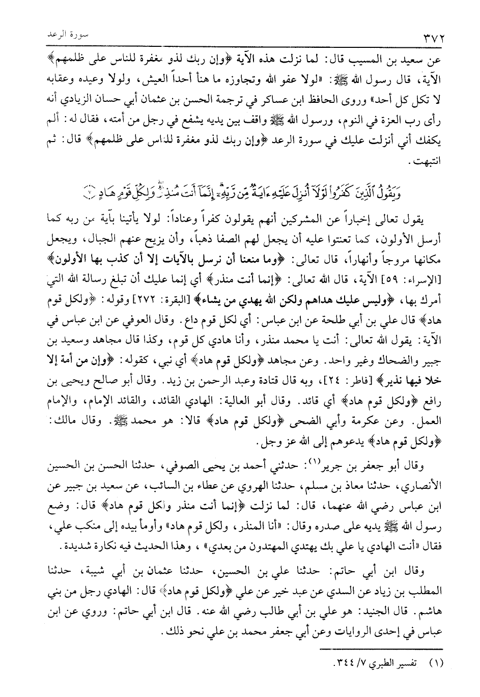 وَقَالَ أَبُو جَعْفَرِ بْنُ جَرِيرٍ «1» : حَدَّثَنِي أَحْمَدُ بْنُ يَحْيَى الصُّوفِيُّ، حَدَّثَنَا الْحَسَنُ بْنُ الْحُسَيْنِ الْأَنْصَارِيُّ، حَدَّثَنَا معاذ بن مسلم، حدثنا الْهَرَوِيِّ عَنْ عَطَاءِ بْنِ السَّائِبِ، عَنْ سَعِيدِ بْنِ جُبَيْرٍ عَنِ ابْنِ عَبَّاسٍ رَضِيَ اللَّهُ عَنْهُمَا، قَالَ: لَمَّا نَزَلَتْ إِنَّما أَنْتَ مُنْذِرٌ وَلِكُلِّ قَوْمٍ هادٍ قَالَ: وَضَعَ رَسُولُ اللَّهِ صَلَّى اللَّهُ عَلَيْهِ وَسَلَّمَ يديه عَلَى صَدْرِهِ وَقَالَ: «أَنَا الْمُنْذِرُ، وَلِكُلِّ قَوْمٍ هَادٍ» وَأَوْمَأَ بِيَدِهِ إِلَى مَنْكِبِ عَلَيٍّ، فَقَالَ «أَنْتَ الْهَادِي يَا عَلِيُّ بِكَ يَهْتَدِي الْمُهْتَدُونَ مِنْ بَعْدِي» ، وَهَذَا الْحَدِيثُ فِيهِ نَكَارَةٌ شَدِيدَةٌ.