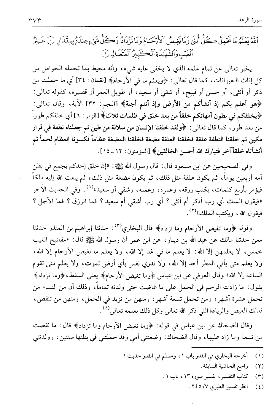 وَقَوْلُهُ وَما تَغِيضُ الْأَرْحامُ وَما تَزْدادُ قَالَ الْبُخَارِيُّ «3» : حَدَّثَنَا إِبْرَاهِيمُ بْنُ الْمُنْذِرِ حَدَّثَنَا مَعْنٌ حَدَّثَنَا مَالِكٌ عَنْ عَبْدِ اللَّهِ بْنِ دِينَارٍ، عَنِ ابْنِ عُمَرَ أَنَّ رَسُولَ اللَّهِ صَلَّى اللَّهُ عَلَيْهِ وَسَلَّمَ قَالَ: «مَفَاتِيحُ الْغَيْبِ خَمْسٌ، لَا يَعْلَمُهُنَّ إِلَّا اللَّهُ: لَا يَعْلَمُ مَا فِي غَدٍ إِلَّا اللَّهُ، وَلَا يَعْلَمُ مَا تَغِيضُ الْأَرْحَامُ إِلَّا اللَّهُ، وَلَا يَعْلَمُ مَتَى يَأْتِي الْمَطَرُ أَحَدٌ إِلَّا اللَّهُ، وَلَا تَدْرِي نَفْسٌ بِأَيِّ أَرْضٍ تَمُوتُ، وَلَا يَعْلَمُ مَتَى تَقُومُ السَّاعَةُ إِلَّا اللَّهُ» وَقَالَ الْعَوْفِيُّ عَنِ ابْنِ عَبَّاسٍ وَما تَغِيضُ الْأَرْحامُ يَعْنِي السَقْطَ، وَما تَزْدادُ يَقُولُ: مَا زَادَتِ الرَّحِمَ فِي الْحَمْلِ عَلَى مَا غَاضَتْ حَتَّى وَلَدَتْهُ تَمَامًا، وَذَلِكَ أَنَّ من النساء من تحمل عشرة أشهر، ومن تَحْمِلُ تِسْعَةَ أَشْهُرَ، وَمِنْهُنَّ مَنْ تَزِيدُ فِي الْحَمْلِ، وَمِنْهُنَّ مَنْ تَنْقُصُ، فَذَلِكَ الْغَيْضُ وَالزِّيَادَةُ الَّتِي ذَكَرَ اللَّهُ تَعَالَى وَكُلُّ ذَلِكَ بِعِلْمِهِ تَعَالَى «4» .