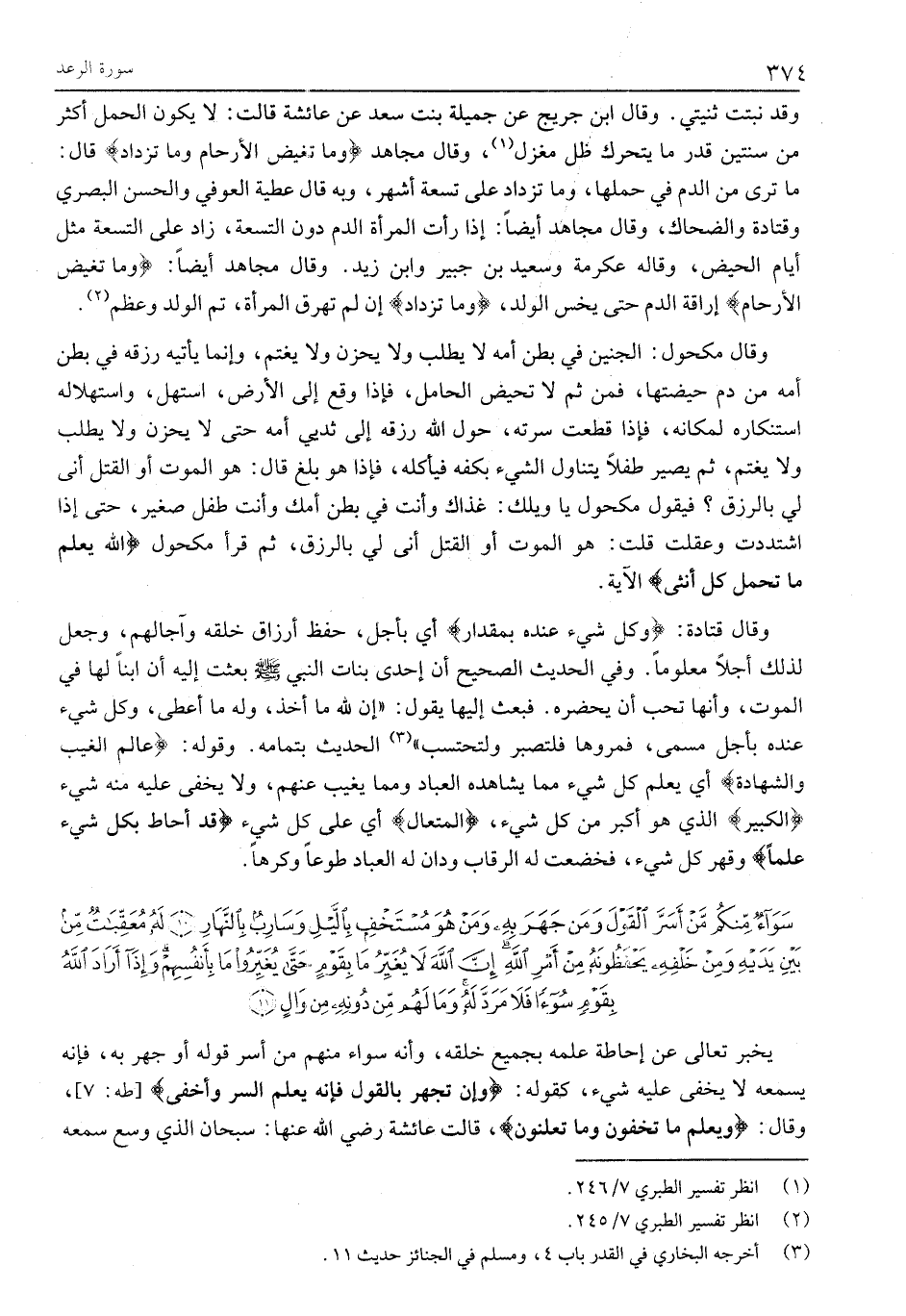 وَقَالَ قَتَادَةُ: وَكُلُّ شَيْءٍ عِنْدَهُ بِمِقْدارٍ أَيْ بِأَجْلٍ، حَفِظَ أَرْزَاقَ خَلْقِهِ وَآجَالَهُمْ، وَجَعَلَ لِذَلِكَ أَجَلًا مَعْلُومًا. وَفِي الْحَدِيثِ الصَّحِيحِ أَنَّ إِحْدَى بَنَاتِ النَّبِيِّ صَلَّى اللَّهُ عَلَيْهِ وَسَلَّمَ بَعَثَتْ إِلَيْهِ أَنَّ ابْنًا لَهَا فِي الْمَوْتِ، وَأَنَّهَا تُحِبُّ أَنْ يَحْضُرَهُ. فَبَعَثَ إِلَيْهَا يَقُولُ: «إِنَّ لِلَّهِ مَا أَخَذَ، وَلَهُ مَا أَعْطَى، وَكُلُّ شَيْءٍ عِنْدَهُ بِأَجَلٍ مُسَمًّى، فَمُرُوهَا فَلْتَصْبِرْ وَلِتَحْتَسِبْ» «3» الْحَدِيثَ بِتَمَامِهِ. وَقَوْلُهُ: عالِمُ الْغَيْبِ وَالشَّهادَةِ أَيْ يَعْلَمُ كُلَّ شَيْءٍ مِمَّا يُشَاهِدُهُ الْعِبَادُ وَمِمَّا يَغِيبُ عَنْهُمْ، وَلَا يَخْفَى عَلَيْهِ مِنْهُ شَيْءٌ الْكَبِيرُ الَّذِي هُوَ أَكْبَرُ مِنْ كُلِّ شَيْءٍ، الْمُتَعالِ أَيْ عَلَى كُلِّ شَيْءٍ قَدْ أَحاطَ بِكُلِّ شَيْءٍ عِلْماً وَقَهَرَ كُلَّ شَيْءٍ، فَخَضَعَتْ لَهُ الرِّقَابُ وَدَانَ لَهُ الْعِبَادُ طَوْعًا وَكَرْهًا.
