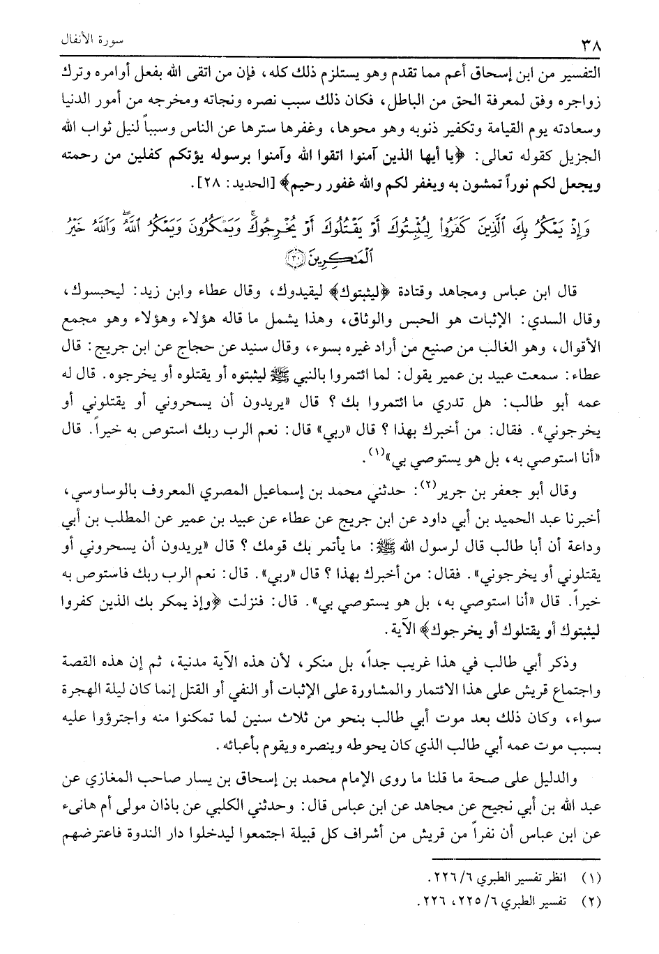 وَذِكْرُ أَبِي طَالِبٍ فِي هَذَا غَرِيبٌ جِدًّا، بَلْ مُنْكَرٌ، لِأَنَّ هَذِهِ الْآيَةَ مَدَنِيَّةٌ، ثُمَّ إِنَّ هَذِهِ الْقِصَّةَ وَاجْتِمَاعَ قُرَيْشٍ عَلَى هَذَا الِائْتِمَارِ وَالْمُشَاوَرَةِ عَلَى الْإِثْبَاتِ أَوِ النَّفْيِ أَوِ الْقَتْلِ إِنَّمَا كَانَ لَيْلَةَ الْهِجْرَةِ سَوَاءً، وَكَانَ ذَلِكَ بَعْدَ مَوْتِ أَبِي طَالِبٍ بِنَحْوٍ مِنْ ثَلَاثِ سِنِينَ لَمَّا تَمَكَّنُوا مِنْهُ وَاجْتَرَءُوا عَلَيْهِ بسبب مَوْتِ عَمِّهِ أَبِي طَالِبٍ الَّذِي كَانَ يَحُوطُهُ وَيَنْصُرُهُ وَيَقُومُ بِأَعْبَائِهِ.