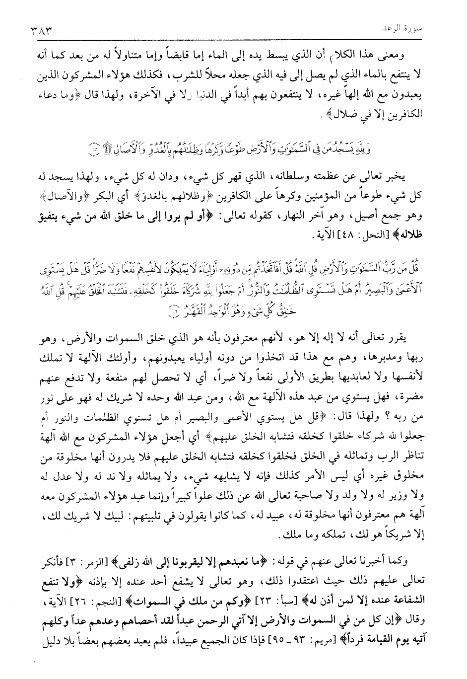 قُلْ مَنْ رَبُّ السَّماواتِ وَالْأَرْضِ قُلِ اللَّهُ قُلْ أَفَاتَّخَذْتُمْ مِنْ دُونِهِ أَوْلِياءَ لَا يَمْلِكُونَ لِأَنْفُسِهِمْ نَفْعاً وَلا ضَرًّا قُلْ هَلْ يَسْتَوِي الْأَعْمى وَالْبَصِيرُ أَمْ هَلْ تَسْتَوِي الظُّلُماتُ وَالنُّورُ أَمْ جَعَلُوا لِلَّهِ شُرَكاءَ خَلَقُوا كَخَلْقِهِ فَتَشابَهَ الْخَلْقُ عَلَيْهِمْ قُلِ اللَّهُ خالِقُ كُلِّ شَيْءٍ وَهُوَ الْواحِدُ الْقَهَّارُ (16)