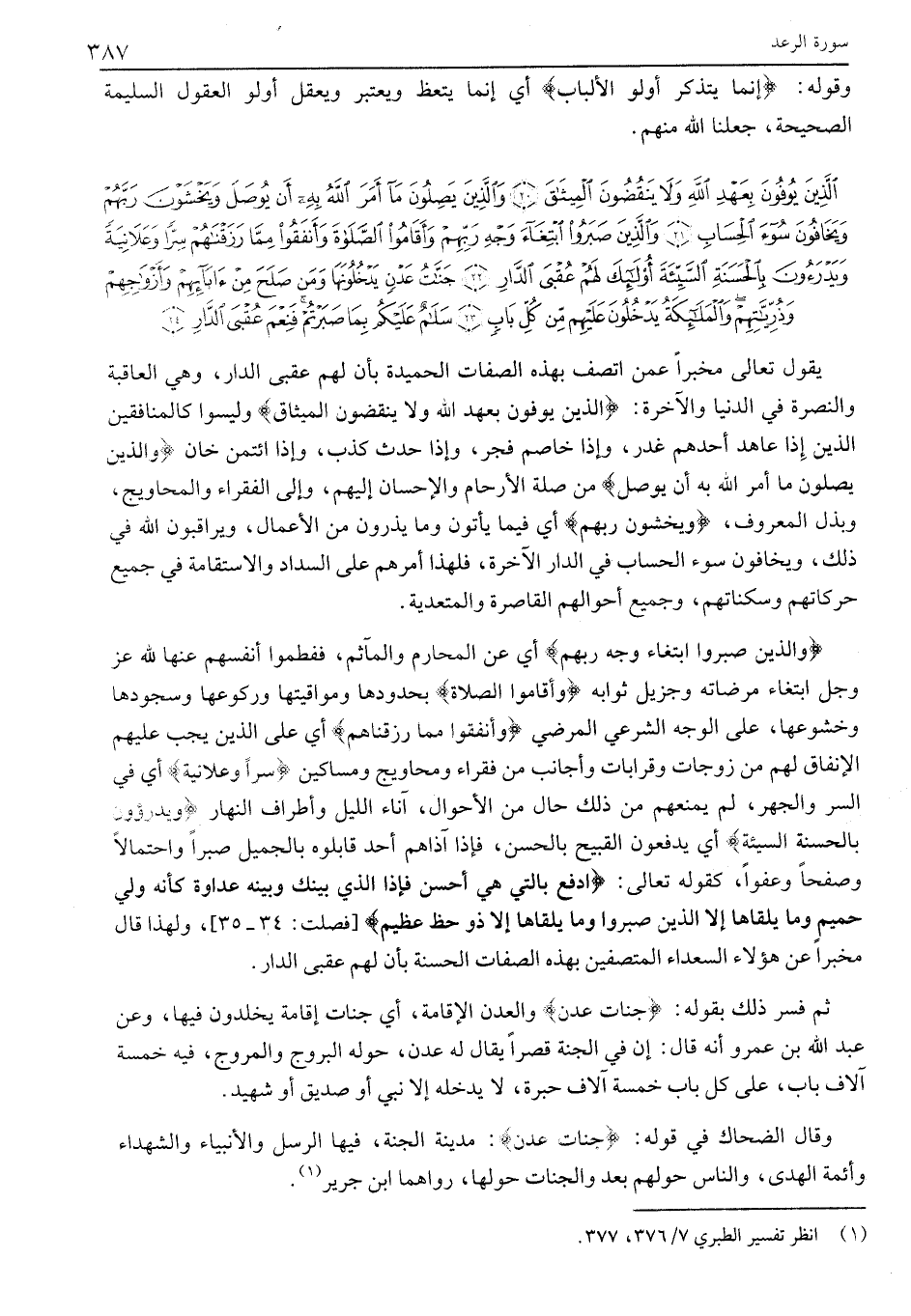الَّذِينَ يُوفُونَ بِعَهْدِ اللَّهِ وَلا يَنْقُضُونَ الْمِيثاقَ (20) وَالَّذِينَ يَصِلُونَ مَا أَمَرَ اللَّهُ بِهِ أَنْ يُوصَلَ وَيَخْشَوْنَ رَبَّهُمْ وَيَخافُونَ سُوءَ الْحِسابِ (21) وَالَّذِينَ صَبَرُوا ابْتِغاءَ وَجْهِ رَبِّهِمْ وَأَقامُوا الصَّلاةَ وَأَنْفَقُوا مِمَّا رَزَقْناهُمْ سِرًّا وَعَلانِيَةً وَيَدْرَؤُنَ بِالْحَسَنَةِ السَّيِّئَةَ أُولئِكَ لَهُمْ عُقْبَى الدَّارِ (22) جَنَّاتُ عَدْنٍ يَدْخُلُونَها وَمَنْ صَلَحَ مِنْ آبائِهِمْ وَأَزْواجِهِمْ وَذُرِّيَّاتِهِمْ وَالْمَلائِكَةُ يَدْخُلُونَ عَلَيْهِمْ مِنْ كُلِّ بابٍ (23) سَلامٌ عَلَيْكُمْ بِما صَبَرْتُمْ فَنِعْمَ عُقْبَى الدَّارِ (24)