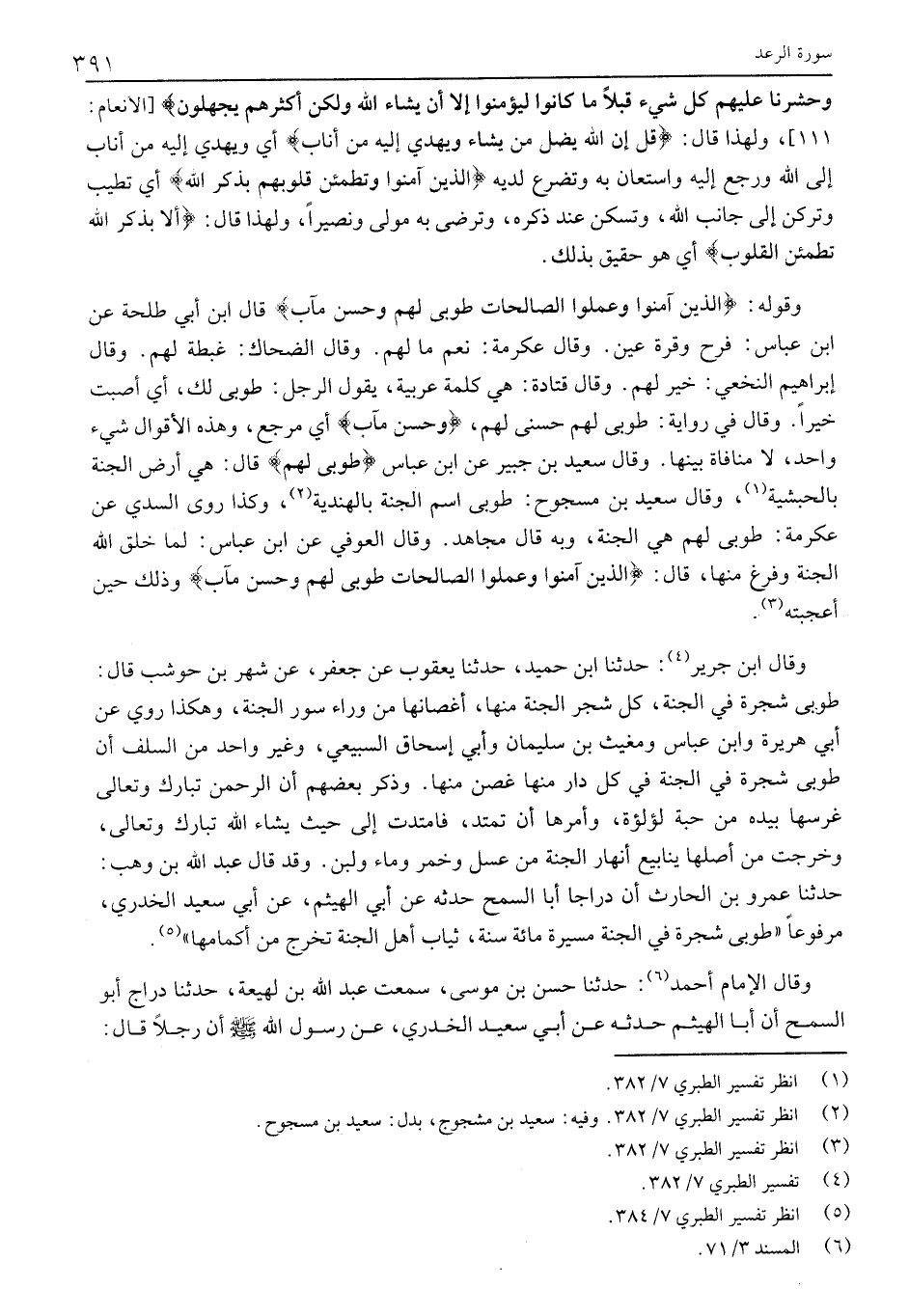 طُوبَى شَجَرَةٌ فِي الْجَنَّةِ، كُلُّ شَجَرِ الْجَنَّةِ مِنْهَا، أَغْصَانُهَا مِنْ وَرَاءِ سُورِ الْجَنَّةِ، وَهَكَذَا رُوِيَ عَنْ أَبِي هُرَيْرَةَ وَابْنِ عَبَّاسٍ وَمُغِيثِ بن سليمان وَأَبِي إِسْحَاقَ السَّبِيعِيِّ، وَغَيْرِ وَاحِدٍ مِنَ السَّلَفِ أَنَّ طُوبَى شَجَرَةٌ فِي الْجَنَّةِ فِي كُلِّ دَارٍ مِنْهَا غُصْنٌ مِنْهَا. وَذَكَرَ بَعْضُهُمْ أَنَّ الرَّحْمَنَ تَبَارَكَ وَتَعَالَى غَرَسَهَا بِيَدِهِ مِنْ حَبَّةِ لُؤْلُؤَةٍ، وَأَمَرَهَا أَنْ تَمْتَدَّ، فَامْتَدَّتْ إِلَى حَيْثُ يَشَاءُ اللَّهُ تَبَارَكَ وَتَعَالَى، وَخَرَجَتْ مِنْ أَصْلِهَا يَنَابِيعُ أَنْهَارِ الْجَنَّةِ مِنْ عَسَلٍ وَخَمْرٍ وَمَاءٍ وَلَبَنٍ. وَقَدْ قَالَ عَبْدُ اللَّهِ بْنُ وَهْبٍ: