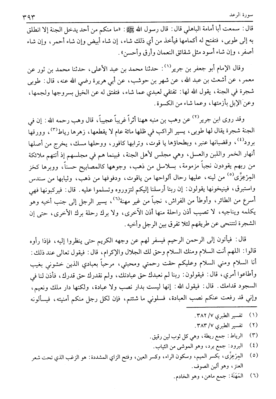 وَقَدْ رَوَى ابْنُ جَرِيرٍ «2» عَنْ وَهْبِ بْنِ مُنَبِّهٍ هَاهُنَا أَثَرًا غَرِيبًا عَجِيبًا، قَالَ وَهْبٌ رَحِمَهُ اللَّهُ: إِنَّ فِي الْجَنَّةِ شَجَرَةً يُقَالُ لَهَا طُوبَى، يَسِيرُ الرَّاكِبُ فِي ظِلِّهَا مِائَةَ عَامٍ لَا يَقْطَعُهَا، زَهْرُهَا رِيَاطٌ «3» ، وَوَرَقُهَا بُرُودٌ «4» ، وَقُضْبَانُهَا عَنْبَرٌ، وَبَطْحَاؤُهَا يَاقُوتٌ، وَتُرَابُهَا كَافُورٌ، وَوَحَلُهَا مِسْكٌ، يَخْرُجُ مِنْ أَصْلِهَا أَنْهَارُ الْخَمْرِ واللبن والعسل، وهي مجلس لأهل الجنة، فبينما هُمْ فِي مَجْلِسِهِمْ إِذْ أَتَتْهُمْ مَلَائِكَةٌ مِنْ رَبِّهِمْ يَقُودُونَ نُجُبًا مَزْمُومَةً، بِسَلَاسِلَ مَنْ ذَهَبٍ، وُجُوهُهَا كَالْمَصَابِيحِ حَسَنًا، وَوَبَرُهَا كَخَزِّ الْمِرْعِزَّى «5» مَنْ لِينِهِ، عَلَيْهَا رِحَالٌ أَلْوَاحُهَا مِنْ يَاقُوتٍ، وَدُفُوفُهَا مَنْ ذَهَبٍ، وَثِيَابُهَا مَنْ سُنْدُسٍ وَإِسْتَبْرَقٍ، فَيُنِيخُونَهَا يقولون: إِنَّ رَبَّنَا أَرْسَلَنَا إِلَيْكُمْ لِتَزُورُوهُ وَتُسَلِّمُوا عَلَيْهِ. قَالَ: فَيَرْكَبُونَهَا فَهِيَ أَسْرَعُ مِنَ الطَّائِرِ، وَأَوْطَأُ من الفراش، نجبا مِنْ غَيْرِ مَهَنَةٍ «6» ، يَسِيرُ الرَّجُلُ إِلَى جَنْبِ أَخِيهِ وَهُوَ يُكَلِّمُهُ وَيُنَاجِيهِ، لَا تُصِيبُ أُذُنُ راحلة منها أذن الأخرى، ولا برك رحلة برك الأخرى، حتى إن الشجرة لِتَتَنَحَّى عَنْ طَرِيقِهِمْ لِئَلَّا تُفَرِّقَ بَيْنَ الرَّجُلِ وَأَخِيهِ.