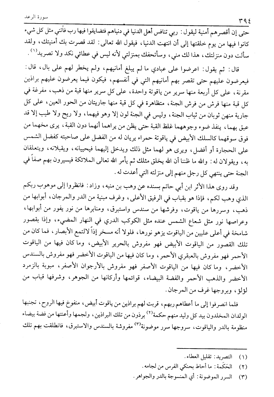 وَقَدْ رَوَى هَذَا الْأَثَرَ ابْنُ أَبِي حَاتِمٍ بِسَنَدِهِ عَنْ وَهْبِ بْنِ مُنَبِّهٍ، وَزَادَ: فَانْظُرُوا إِلَى مَوْهُوبِ رَبِّكُمُ الَّذِي وَهَبَ لَكُمْ، فَإِذَا هُوَ بِقِبَابٍ فِي الرَّفِيقِ الأعلى، وغرف مبنية من الدر والمرجان، أبوابها مَنْ ذَهَبٍ، وَسُرُرُهَا مِنْ يَاقُوتٍ، وَفُرُشُهَا مَنْ سُنْدُسٍ وَإِسْتَبْرَقٍ، وَمَنَابِرُهَا مِنْ نُورٍ يَفُورُ مِنْ أَبْوَابِهَا، وَعِرَاصِهَا نُورٌ مِثْلَ شُعَاعِ الشَّمْسِ عِنْدَهُ مِثْلَ الْكَوْكَبِ الدُّرِّيِّ فِي النَّهَارِ الْمُضِيءِ، وَإِذَا بِقُصُورٍ شَامِخَةٍ فِي أَعْلَى عِلِّيِّينَ مِنَ الْيَاقُوتِ يَزْهُو نُورُهَا، فَلَوْلَا أَنَّهُ مُسَخَّرٌ إذًا لَالْتَمَعَ الْأَبْصَارَ، فَمَا كَانَ مِنْ تِلْكَ الْقُصُورِ مِنَ الْيَاقُوتِ الْأَبْيَضِ فَهُوَ مَفْرُوشٌ بِالْحَرِيرِ الْأَبْيَضِ، وَمَا كان فيها مِنَ الْيَاقُوتِ الْأَحْمَرِ فَهُوَ مَفْرُوشٌ بِالْعَبْقَرِيِّ الْأَحْمَرِ، وما كان فيها مِنَ الْيَاقُوتِ الْأَخْضَرِ فَهُوَ مَفْرُوشٌ بِالسُّنْدُسِ الْأَخْضَرِ، وما كان فيها مِنَ الْيَاقُوتِ الْأَصْفَرِ فَهُوَ مَفْرُوشٌ بِالْأُرْجُوَانِ الْأَصْفَرِ، مبوبة بِالزُّمُرُّدِ الْأَخْضَرِ وَالذَّهَبِ الْأَحْمَرِ وَالْفِضَّةِ الْبَيْضَاءِ، قَوَائِمُهَا وَأَرْكَانُهَا مِنَ الْجَوْهَرِ، وَشُرَفُهَا قِبَابٌ مِنْ لُؤْلُؤٍ، وَبُرُوجُهَا غُرَفٌ مِنَ الْمَرْجَانِ.