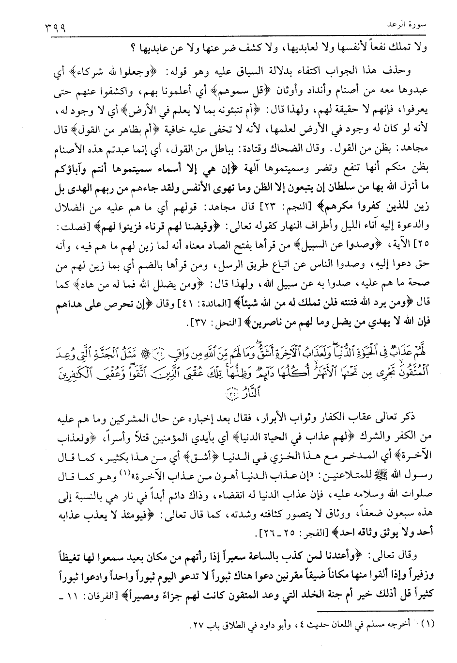 25] الآية، وَصُدُّوا عَنِ السَّبِيلِ مَنْ قَرَأَهَا بِفَتْحِ الصَّادِ معناه أنه لما زين لهم ما هم فِيهِ، وَأَنَّهُ حَقٌّ دَعَوْا إِلَيْهِ، وَصَدُّوا النَّاسَ عن اتباع طريق الرسل، ومن قرأها بالضم أَيْ بِمَا زُيِّنَ لَهُمْ مِنْ صِحَّةِ مَا هُمْ عَلَيْهِ، صُدُّوا بِهِ عَنْ سَبِيلِ اللَّهِ، وَلِهَذَا قَالَ: وَمَنْ يُضْلِلِ اللَّهُ فَما لَهُ مِنْ هادٍ كَمَا قَالَ وَمَنْ يُرِدِ اللَّهُ فِتْنَتَهُ فَلَنْ تَمْلِكَ لَهُ مِنَ اللَّهِ شَيْئاً [الْمَائِدَةِ: 41] وَقَالَ إِنْ تَحْرِصْ عَلى هُداهُمْ فَإِنَّ اللَّهَ لَا يَهْدِي مَنْ يُضِلُّ وَما لَهُمْ مِنْ ناصِرِينَ [النحل: 37] .