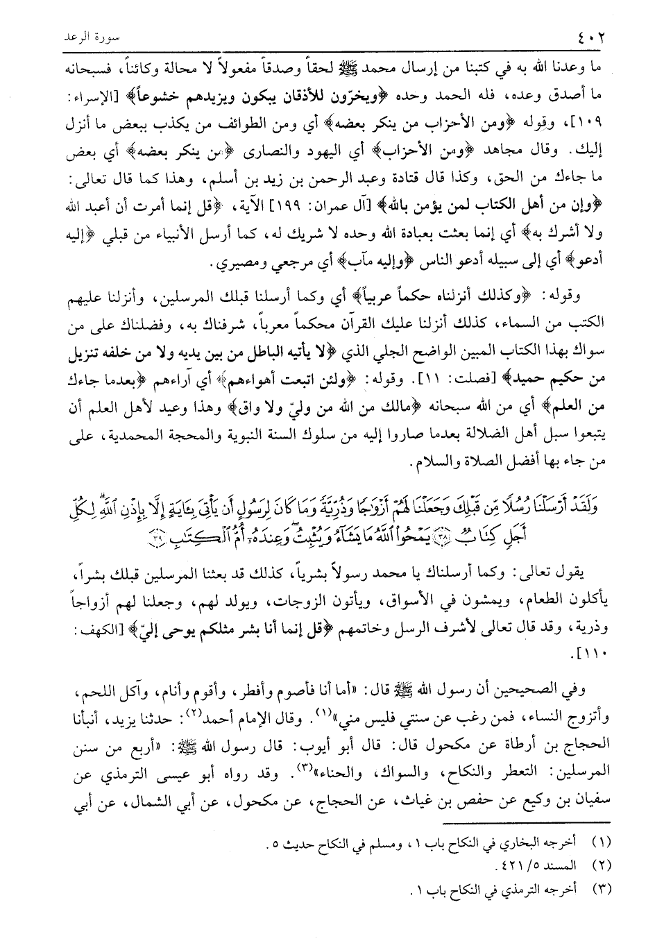 وَلَقَدْ أَرْسَلْنا رُسُلاً مِنْ قَبْلِكَ وَجَعَلْنا لَهُمْ أَزْواجاً وَذُرِّيَّةً وَما كانَ لِرَسُولٍ أَنْ يَأْتِيَ بِآيَةٍ إِلاَّ بِإِذْنِ اللَّهِ لِكُلِّ أَجَلٍ كِتابٌ (38) يَمْحُوا اللَّهُ مَا يَشاءُ وَيُثْبِتُ وَعِنْدَهُ أُمُّ الْكِتابِ (39)