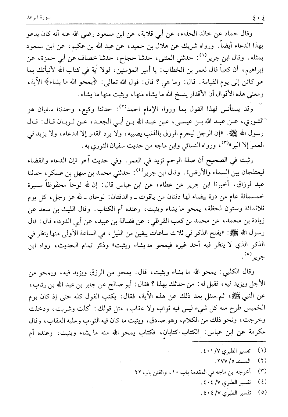 وَقَالَ حَمَّادٌ عَنْ خَالِدٍ الْحَذَّاءِ، عَنْ أَبِي قلابة، عن ابن مسعود رضي الله عنه أَنَّهُ كَانَ يَدْعُو بِهَذَا الدُّعَاءِ أَيْضًا. وَرَوَاهُ شَرِيكٌ عَنْ هِلَالِ بْنِ حُمَيْدٍ، عَنْ عَبْدِ اللَّهِ بْنِ عُكَيْمٍ، عَنِ ابْنِ مَسْعُودٍ بِمَثَلِهِ. وقال ابن جرير «1» : حدثني المثنى، حدثنا حجاج، حَدَّثَنَا خِصَافٌ عَنْ أَبِي حَمْزَةَ، عَنْ إِبْرَاهِيمَ، أَنَّ كَعْبًا قَالَ لِعُمَرَ بْنِ الْخَطَّابِ: يَا أَمِيرَ الْمُؤْمِنِينَ، لَوْلَا آيَةٌ فِي كِتَابِ اللَّهِ لَأَنْبَأْتُكَ بِمَا هُوَ كَائِنٌ إِلَى يَوْمِ الْقِيَامَةِ. قَالَ: وَمَا هِيَ؟ قَالَ: قَوْلُ اللَّهِ تَعَالَى: يَمْحُوا اللَّهُ ما يَشاءُ الآية، وَمَعْنَى هَذِهِ الْأَقْوَالِ أَنَّ الْأَقْدَارَ يَنْسَخُ اللَّهُ مَا يَشَاءُ مِنْهَا، وَيُثْبِتُ مِنْهَا مَا يَشَاءُ.