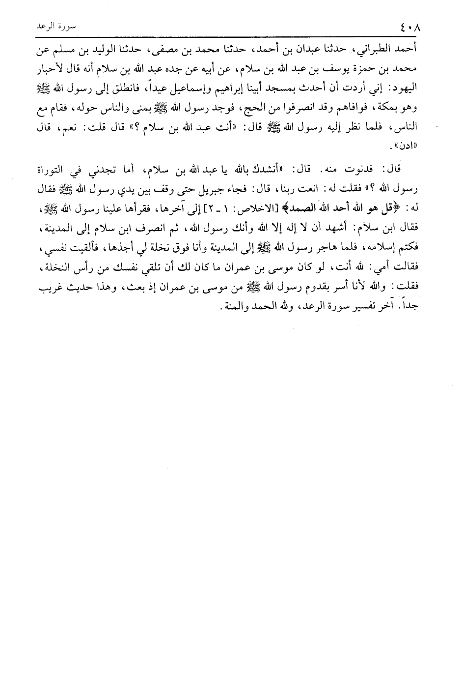 قال: فَدَنَوْتُ مِنْهُ. قَالَ: «أَنْشُدُكَ بِاللَّهِ يَا عَبْدَ اللَّهِ بْنَ سَلَامٍ، أَمَا تَجِدُنِي فِي التَّوْرَاةِ رَسُولَ اللَّهِ؟» فَقُلْتُ لَهُ: انْعَتْ رَبَّنَا، قَالَ: فَجَاءَ جِبْرِيلُ حَتَّى وَقَفَ بَيْنَ يَدَيْ رَسُولِ اللَّهِ صَلَّى اللَّهُ عَلَيْهِ وَسَلَّمَ فَقَالَ لَهُ: قُلْ هُوَ اللَّهُ أَحَدٌ اللَّهُ الصَّمَدُ [الإخلاص: 1- 2] إلى آخرها، فَقَرَأَهَا عَلَيْنَا رَسُولُ اللَّهِ صَلَّى اللَّهُ عَلَيْهِ وَسَلَّمَ، فَقَالَ ابْنُ سَلَامٍ: أَشْهَدُ أَنْ لَا إِلَهَ إِلَّا اللَّهُ وَأَنَّكَ رَسُولُ اللَّهِ، ثُمَّ انْصَرَفَ ابْنُ سَلَامٍ إِلَى الْمَدِينَةِ، فَكَتَمَ إِسْلَامَهُ، فَلَمَّا هَاجَرَ رَسُولُ اللَّهِ صَلَّى اللَّهُ عَلَيْهِ وَسَلَّمَ إِلَى الْمَدِينَةِ وَأَنَا فَوْقَ نَخْلَةٍ لِي أجذها، فَأَلْقَيْتُ نَفْسِي، فَقَالَتْ أُمِّي: لِلَّهِ أَنْتَ، لَوْ كَانَ مُوسَى بْنُ عِمْرَانَ مَا كَانَ لَكَ أَنْ تُلْقِيَ نَفْسَكَ مِنْ رَأْسِ النَّخْلَةِ، فَقُلْتُ: والله لأنا أَسَرُّ بِقُدُومِ رَسُولِ اللَّهِ صَلَّى اللَّهُ عَلَيْهِ وَسَلَّمَ مِنْ مُوسَى بْنِ عِمْرَانَ إِذْ بُعِثَ، وهذا حديث غريب جدا. آخر تفسير سورة الرعد، ولله الحمد والمنة.