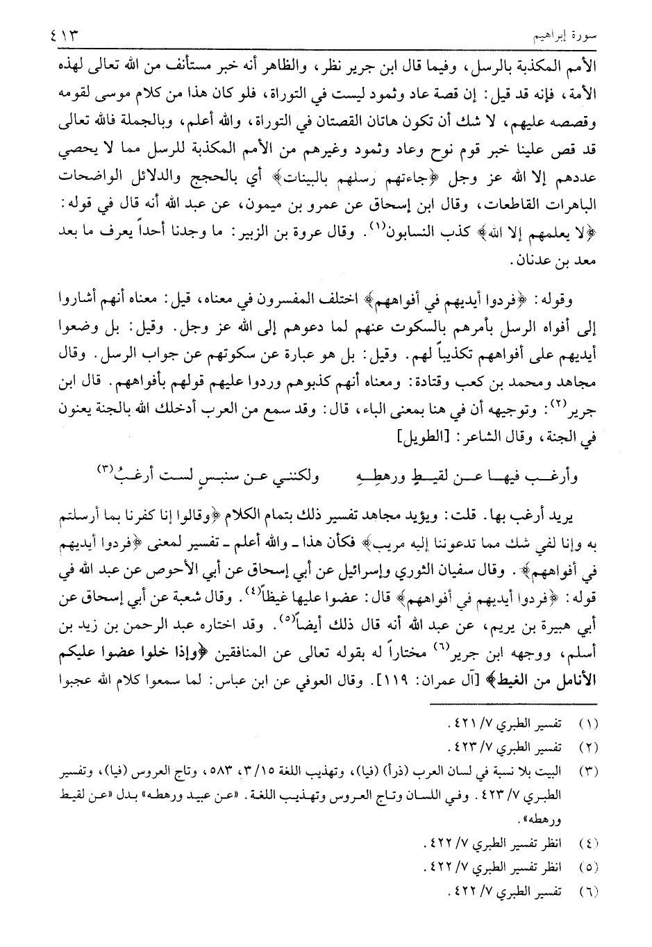 وَقَوْلُهُ: فَرَدُّوا أَيْدِيَهُمْ فِي أَفْواهِهِمْ اخْتَلَفَ الْمُفَسِّرُونَ فِي معناه، قيل: معناه أنهم أشاروا إلى أفواه الرسل بأمرهم بِالسُّكُوتِ عَنْهُمْ لَمَّا دَعَوْهُمْ إِلَى اللَّهِ عَزَّ وَجَلَّ. وَقِيلَ: بَلْ وَضَعُوا أَيْدِيَهُمْ عَلَى أَفْوَاهِهِمْ تَكْذِيبًا لَهُمْ. وَقِيلَ: بَلْ هُوَ عِبَارَةٌ عَنْ سُكُوتِهِمْ عَنْ جَوَابِ الرُّسُلِ. وَقَالَ مُجَاهِدٌ وَمُحَمَّدُ بن كعب وقتادة: ومعناه أَنَّهُمْ كَذَّبُوهُمْ وَرَدُّوا عَلَيْهِمْ قَوْلَهُمْ بِأَفْوَاهِهِمْ. قَالَ ابن جرير «2» : وتوجيهه أن في هنا بِمَعْنَى الْبَاءِ، قَالَ: وَقَدْ سُمِعَ مِنَ الْعَرَبِ أَدْخَلَكَ اللَّهُ بِالْجَنَّةِ يَعْنُونَ فِي الْجَنَّةِ، وَقَالَ الشاعر: [الطويل]