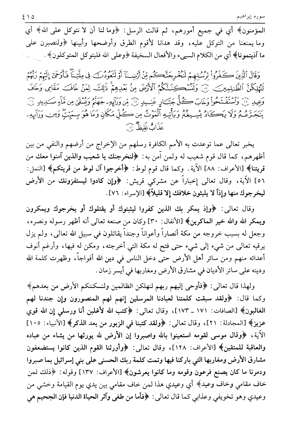 وَلِهَذَا قَالَ تَعَالَى: فَأَوْحى إِلَيْهِمْ رَبُّهُمْ لَنُهْلِكَنَّ الظَّالِمِينَ وَلَنُسْكِنَنَّكُمُ الْأَرْضَ مِنْ بَعْدِهِمْ وكما قَالَ: وَلَقَدْ سَبَقَتْ كَلِمَتُنا لِعِبادِنَا الْمُرْسَلِينَ إِنَّهُمْ لَهُمُ الْمَنْصُورُونَ وَإِنَّ جُنْدَنا لَهُمُ الْغالِبُونَ [الصَّافَّاتِ: 171- 173] ، وَقَالَ تَعَالَى: كَتَبَ اللَّهُ لَأَغْلِبَنَّ أَنَا وَرُسُلِي إِنَّ اللَّهَ قَوِيٌّ عَزِيزٌ [الْمُجَادَلَةِ: 21] ، وَقَالَ تَعَالَى: وَلَقَدْ كَتَبْنا فِي الزَّبُورِ مِنْ بَعْدِ الذِّكْرِ [الأنبياء: 105] الآية، قالَ مُوسى لِقَوْمِهِ اسْتَعِينُوا بِاللَّهِ وَاصْبِرُوا إِنَّ الْأَرْضَ لِلَّهِ يُورِثُها مَنْ يَشاءُ مِنْ عِبادِهِ وَالْعاقِبَةُ لِلْمُتَّقِينَ [الْأَعْرَافِ: 128] ، وَقَالَ تَعَالَى: وَأَوْرَثْنَا الْقَوْمَ الَّذِينَ كانُوا يُسْتَضْعَفُونَ مَشارِقَ الْأَرْضِ وَمَغارِبَهَا الَّتِي بارَكْنا فِيها وَتَمَّتْ كَلِمَتُ رَبِّكَ الْحُسْنى عَلى بَنِي إِسْرائِيلَ بِما صَبَرُوا وَدَمَّرْنا مَا كانَ يَصْنَعُ فِرْعَوْنُ وَقَوْمُهُ وَما كانُوا يَعْرِشُونَ [الْأَعْرَافِ: 137] وَقَوْلُهُ: ذلِكَ لِمَنْ خافَ مَقامِي وَخافَ وَعِيدِ أَيْ وَعِيدِي هَذَا لِمَنْ خَافَ مَقَامِي بَيْنَ يَدَيْ يَوْمَ الْقِيَامَةِ وَخَشِيَ مِنْ وَعِيدِي وَهُوَ تَخْوِيفِي وَعَذَابِي كَمَا قَالَ تَعَالَى: فَأَمَّا مَنْ طَغى وَآثَرَ الْحَياةَ الدُّنْيا فَإِنَّ الْجَحِيمَ هِيَ الْمَأْوى
