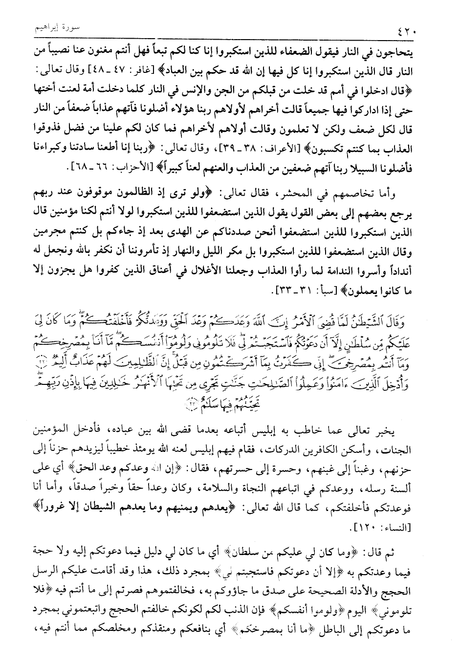 ثُمَّ قَالَ: وَما كانَ لِي عَلَيْكُمْ مِنْ سُلْطانٍ أَيْ ما كان لي دليل فيما دعوتكم إليه ولا حجة فيما وَعَدْتُكُمْ بِهِ إِلَّا أَنْ دَعَوْتُكُمْ فَاسْتَجَبْتُمْ لِي بِمُجَرَّدِ ذَلِكَ، هَذَا وَقَدْ أَقَامَتْ عَلَيْكُمُ الرُّسُلُ الْحُجَجَ وَالْأَدِلَّةَ الصَّحِيحَةَ عَلَى صِدْقِ مَا جَاءُوكُمْ بِهِ، فَخَالَفْتُمُوهُمْ فَصِرْتُمْ إِلَى مَا أَنْتُمْ فِيهِ فَلا تَلُومُونِي الْيَوْمَ وَلُومُوا أَنْفُسَكُمْ فَإِنَّ الذَّنْبَ لَكُمْ لِكَوْنِكُمْ خَالَفْتُمُ الْحُجَجَ وَاتَّبَعْتُمُونِي بِمُجَرَّدِ مَا دَعَوْتُكُمْ إِلَى الْبَاطِلِ مَا أَنَا بِمُصْرِخِكُمْ أَيْ بِنَافِعِكُمْ وَمُنْقِذِكُمْ وَمُخَلِّصِكُمْ مِمَّا أَنْتُمْ فِيهِ،