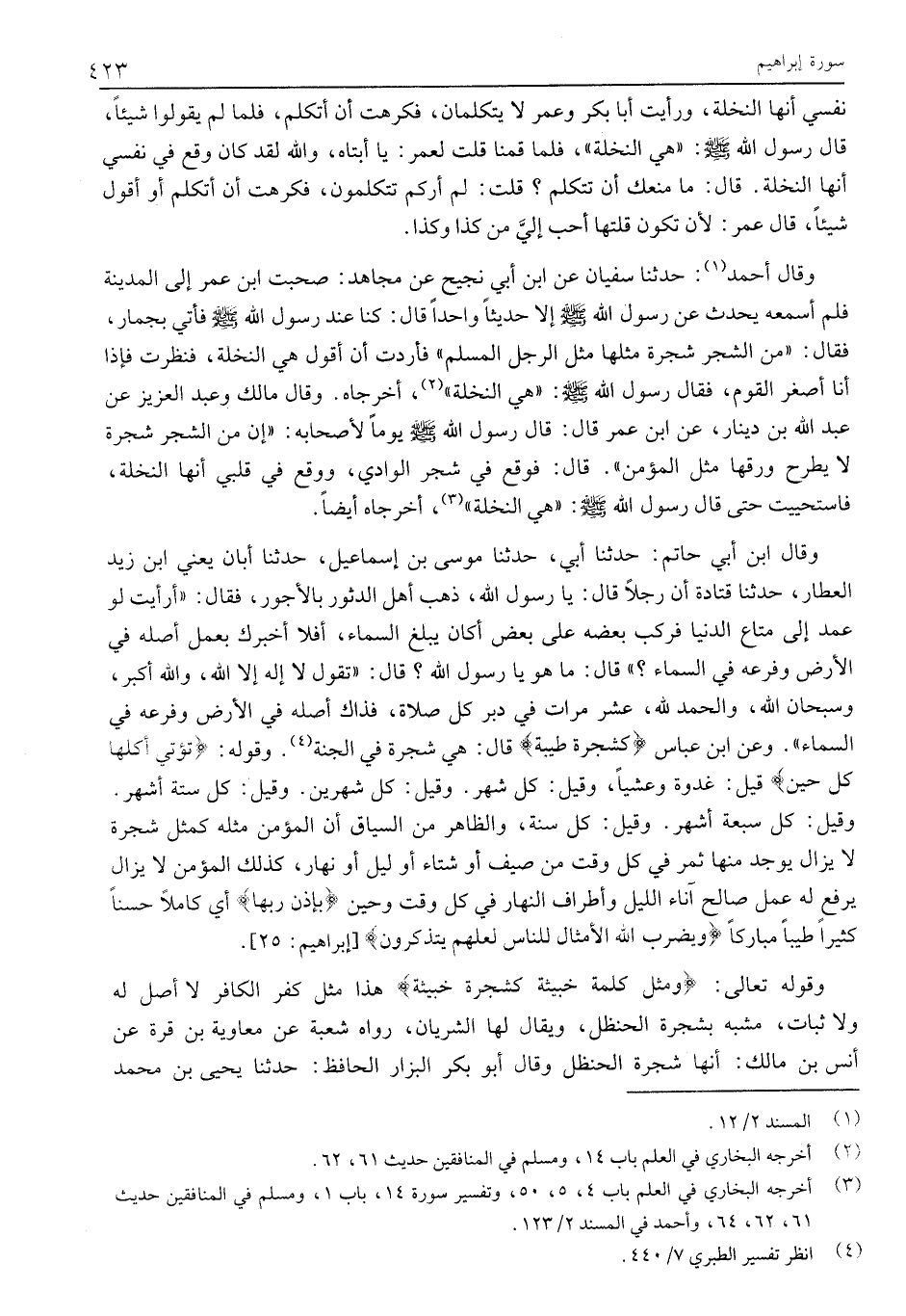 وَقَالَ أَحْمَدُ «1» : حَدَّثَنَا سُفْيَانُ عَنِ ابْنِ أَبِي نَجِيحٍ عَنْ مُجَاهِدٍ: صَحِبْتُ ابْنَ عُمَرَ إِلَى الْمَدِينَةِ فَلَمْ أَسْمَعْهُ يُحَدِّثُ عَنْ رَسُولِ اللَّهِ صَلَّى اللَّهُ عَلَيْهِ وَسَلَّمَ إِلَّا حَدِيثًا وَاحِدًا قَالَ: كُنَّا عِنْدَ رَسُولِ اللَّهِ صَلَّى اللَّهُ عَلَيْهِ وسلم فَأَتَى بِجِمَارٍ، فَقَالَ: «مِنَ الشَّجَرِ شَجَرَةٌ مَثَلُهَا مَثَلُ الرَّجُلِ الْمُسْلِمِ» فَأَرَدْتُ أَنْ أَقُولَ هِيَ النخلة، فنظرت فإذا أنا أصغر الْقَوْمُ، فَقَالَ رَسُولُ اللَّهِ صَلَّى اللَّهُ عَلَيْهِ وَسَلَّمَ: «هِيَ النَّخْلَةُ» «2» ، أَخْرَجَاهُ. وَقَالَ مَالِكٌ وَعَبْدُ الْعَزِيزِ عَنْ عَبْدِ اللَّهِ بْنِ دِينَارٍ، عَنِ ابْنِ عُمَرَ قَالَ: قَالَ رَسُولُ اللَّهِ صَلَّى اللَّهُ عَلَيْهِ وَسَلَّمَ يَوْمًا لِأَصْحَابِهِ: «إِنَّ مِنَ الشَّجَرِ شَجَرَةً لَا يَطْرَحُ وَرَقُهَا مِثْلُ الْمُؤْمِنِ» . قَالَ: فوقع في شجر الوادي، وَوَقَعَ فِي قَلْبِي أَنَّهَا النَّخْلَةُ، فَاسْتَحْيَيْتُ حَتَّى قَالَ رَسُولُ اللَّهِ صَلَّى اللَّهُ عَلَيْهِ وَسَلَّمَ: «هِيَ النَّخْلَةُ» «3» ، أَخْرَجَاهُ أَيْضًا.