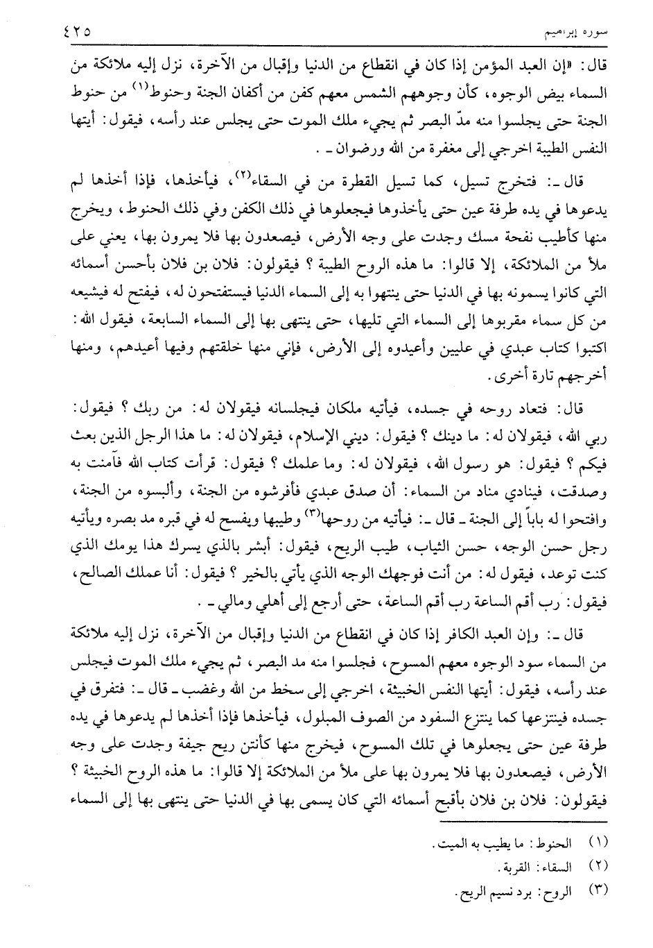 قَالَ: «إِنَّ الْعَبْدَ الْمُؤْمِنَ إِذَا كَانَ فِي انْقِطَاعٍ مِنَ الدُّنْيَا وَإِقْبَالٍ مِنَ الْآخِرَةِ، نَزَلَ إِلَيْهِ مَلَائِكَةٌ مِنَ السَّمَاءِ بِيضُ الْوُجُوهِ، كَأَنَّ وُجُوهَهُمُ الشَّمْسُ مَعَهُمْ كَفَنٌ مِنْ أَكْفَانِ الْجَنَّةِ وَحَنُوطٌ «1» مِنْ حَنُوطِ الْجَنَّةِ حَتَّى يَجْلِسُوا مِنْهُ مَدَّ الْبَصَرِ ثُمَّ يَجِيءُ مَلَكُ الْمَوْتِ حَتَّى يَجْلِسَ عِنْدَ رَأْسِهِ، فَيَقُولُ: أَيَّتُهَا النَّفْسُ الطَّيِّبَةُ اخْرُجِي إِلَى مَغْفِرَةٍ مِنَ اللَّهِ وَرِضْوَانٍ-.