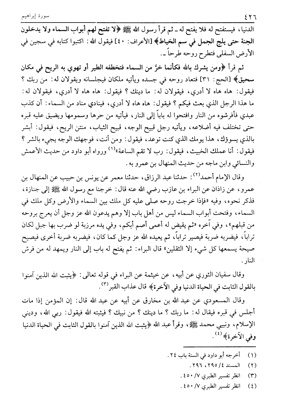 وَقَالَ سُفْيَانُ الثَّوْرِيُّ عَنْ أَبِيهِ، عَنْ خَيْثَمَةَ عَنِ الْبَرَاءِ فِي قَوْلِهِ تَعَالَى: يُثَبِّتُ اللَّهُ الَّذِينَ آمَنُوا بِالْقَوْلِ الثَّابِتِ فِي الْحَياةِ الدُّنْيا وَفِي الْآخِرَةِ قَالَ عَذَابُ الْقَبْرِ «3» .