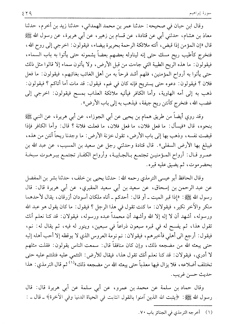 وَقَالَ الْحَافِظُ أَبُو عِيسَى التِّرْمِذِيُّ رَحِمَهُ اللَّهُ: حَدَّثَنَا يَحْيَى بْنُ خَلَفٍ، حَدَّثَنَا بِشْرِ بْنِ الْمُفَضَّلِ عَنْ عَبْدِ الرَّحْمَنِ بْنِ إِسْحَاقَ، عَنْ سَعِيدُ بْنُ أَبِي سَعِيدٍ الْمَقْبُرِيُّ، عَنْ أَبِي هُرَيْرَةَ قَالَ: قَالَ رَسُولُ اللَّهِ صَلَّى اللَّهُ عَلَيْهِ وَسَلَّمَ: «إِذَا قُبِرَ الْمَيِّتُ- أَوْ قَالَ: أَحَدُكُمْ- أَتَاهُ مَلَكَانِ أَسْوَدَانِ أَزْرَقَانِ، يُقَالُ لِأَحَدِهِمَا منكر والآخر نكير، فَيَقُولَانِ: مَا كُنْتَ تَقُولُ فِي هَذَا الرَّجُلِ؟ فَيَقُولُ: مَا كَانَ يَقُولُ هُوَ عَبْدُ اللَّهِ وَرَسُولُهُ، أَشْهَدُ أَنْ لَا إِلَهَ إِلَّا اللَّهُ وَأَشْهَدُ أَنَّ مُحَمَّدًا عَبْدُهُ وَرَسُولُهُ، فَيَقُولَانِ: قَدْ كُنَّا نَعْلَمُ أَنَّكَ تَقُولُ هَذَا، ثُمَّ يُفْسَحُ لَهُ فِي قَبْرِهِ سَبْعُونَ ذِرَاعًا فِي سَبْعِينَ، وينور لَهُ فِيهِ، ثُمَّ يُقَالُ لَهُ: نَمْ، فَيَقُولُ: أَرْجِعُ إِلَى أَهْلِي فَأُخْبِرُهُمْ، فَيَقُولَانِ: نَمْ نَوْمَةَ الْعَرُوسِ الَّذِي لَا يُوقِظُهُ إِلَّا أَحَبُّ أَهْلِهِ إِلَيْهِ حَتَّى يَبْعَثَهُ اللَّهُ مِنْ مَضْجَعِهِ ذَلِكَ، وَإِنْ كَانَ مُنَافِقًا قَالَ: سَمِعْتُ النَّاسَ يَقُولُونَ: فَقُلْتُ مَثَلَهُمْ لَا أَدْرِي، فَيَقُولَانِ: قَدْ كُنَّا نعلم أنك تقول هذا، فيقال للأرض: التئمي عليه فتلتئم عليه حتى تختلف أَضْلَاعُهُ، فَلَا يَزَالُ فِيهَا مُعَذَّبًا حَتَّى يَبْعَثَهُ اللَّهُ مِنْ مَضْجَعِهِ ذَلِكَ» «1» ثُمَّ قَالَ التِّرْمِذِيُّ: هَذَا حَدِيثٌ حَسَنٌ غَرِيبٌ.