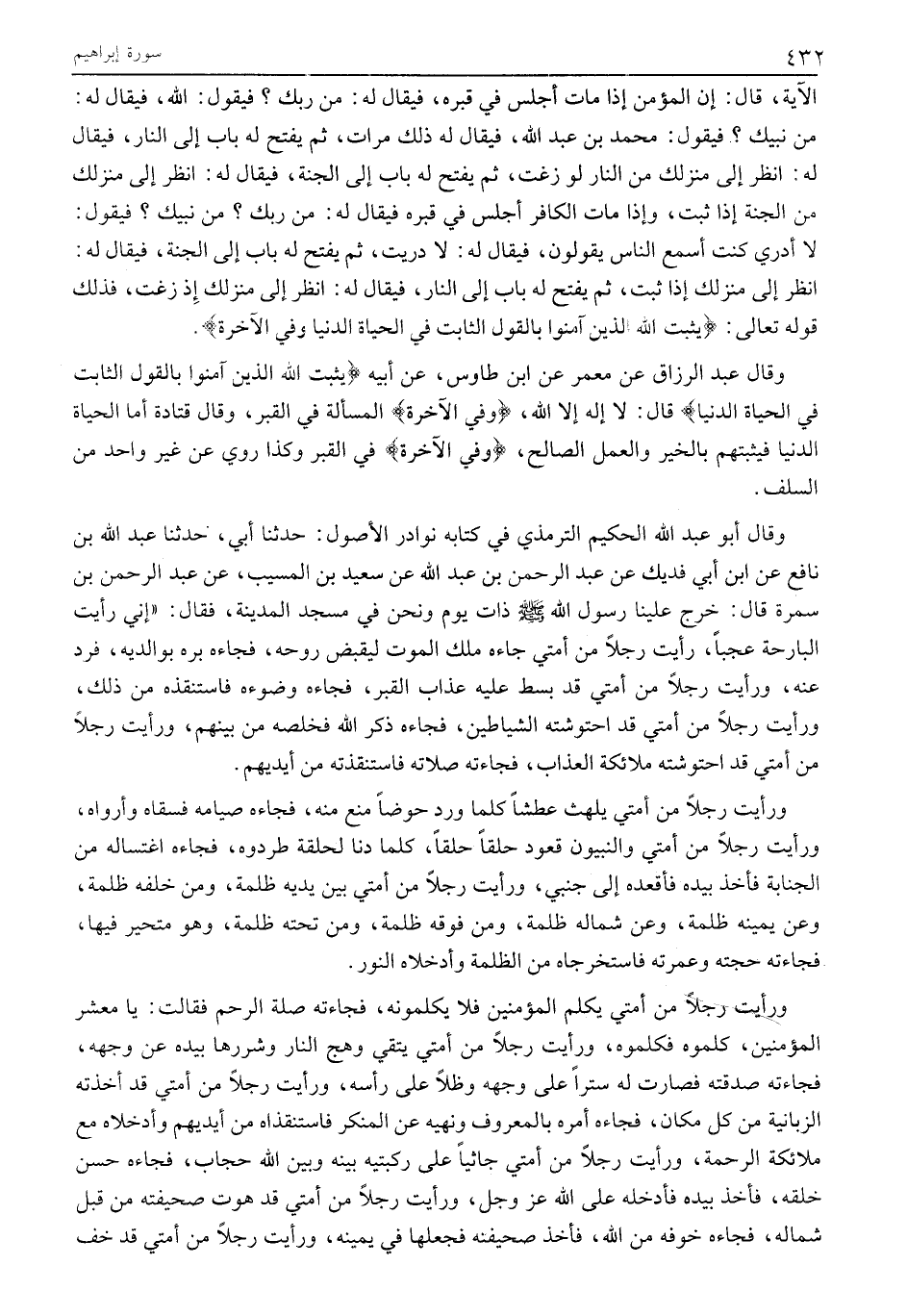 وَقَالَ أَبُو عَبْدِ اللَّهِ الْحَكِيمُ التِّرْمِذِيُّ فِي كِتَابِهِ نَوَادِرِ الْأُصُولِ: حَدَّثَنَا أَبِي، حَدَّثَنَا عَبْدُ اللَّهِ بْنُ نَافِعٍ عَنِ ابْنِ أَبِي فُدَيْكٍ عَنْ عَبْدِ الرَّحْمَنِ بْنِ عَبْدِ اللَّهِ عَنْ سَعِيدِ بْنِ الْمُسَيَّبِ، عَنْ عَبْدِ الرَّحْمَنِ بْنِ سَمُرَةَ قَالَ: خَرَجَ عَلَيْنَا رَسُولُ اللَّهِ صَلَّى اللَّهُ عَلَيْهِ وَسَلَّمَ ذَاتَ يَوْمٍ وَنَحْنُ فِي مَسْجِدِ الْمَدِينَةِ، فَقَالَ: «إِنِّي رَأَيْتُ الْبَارِحَةَ عَجَبًا، رَأَيْتُ رَجُلًا مِنْ أُمَّتِي جَاءَهُ مَلَكُ الْمَوْتِ لِيَقْبِضَ رُوحَهُ، فَجَاءَهُ بِرُّهُ بِوَالِدَيْهِ، فَرَدَّ عَنْهُ، وَرَأَيْتُ رَجُلًا مِنْ أُمَّتِي قَدْ بُسِطَ عَلَيْهِ عَذَابُ الْقَبْرِ، فَجَاءَهُ وُضُوءُهُ فَاسْتَنْقَذَهُ مِنْ ذَلِكَ، وَرَأَيْتُ رَجُلًا مِنْ أُمَّتِي قَدِ احْتَوَشَتْهُ الشَّيَاطِينُ، فَجَاءَهُ ذِكْرُ اللَّهِ فَخَلَّصَهُ مِنْ بَيْنِهِمْ، وَرَأَيْتُ رَجُلًا مِنْ أُمَّتِي قَدِ احْتَوَشَتْهُ مَلَائِكَةُ الْعَذَابِ، فَجَاءَتْهُ صَلَاتُهُ فَاسْتَنْقَذَتْهُ مِنْ أَيْدِيهِمْ.