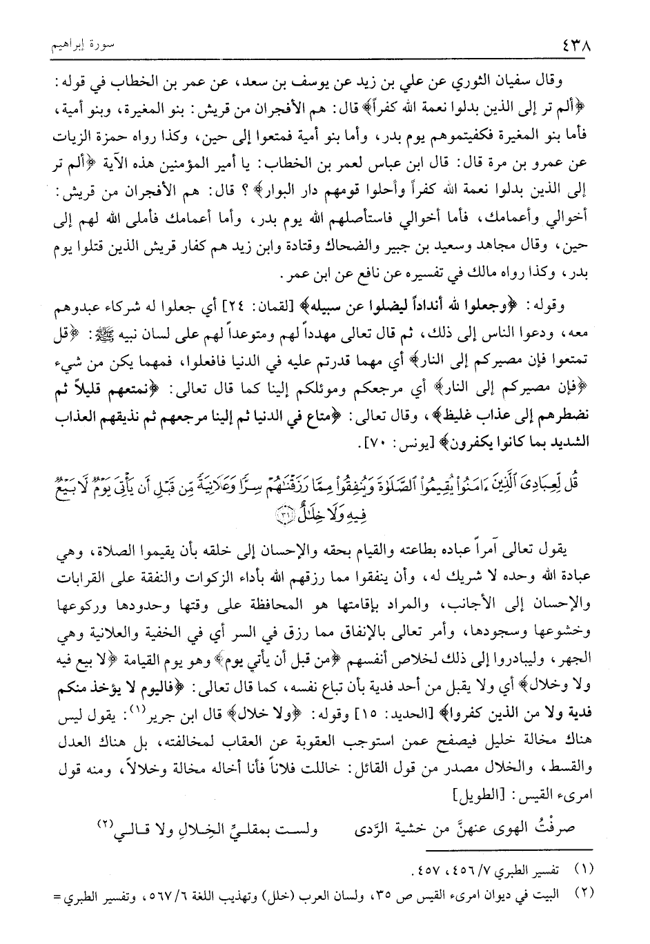 يقول تعالى آمرا عباده بِطَاعَتِهِ وَالْقِيَامِ بِحَقِّهِ وَالْإِحْسَانِ إِلَى خَلْقِهِ بِأَنْ يُقِيمُوا الصَّلَاةَ، وَهِيَ عِبَادَةُ اللَّهِ وَحْدَهُ لَا شَرِيكَ لَهُ، وَإِنْ يُنْفِقُوا مِمَّا رَزَقَهُمُ اللَّهُ بِأَدَاءِ الزَّكَوَاتِ وَالنَّفَقَةِ عَلَى الْقَرَابَاتِ وَالْإِحْسَانِ إِلَى الْأَجَانِبِ، وَالْمُرَادُ بِإِقَامَتِهَا هُوَ الْمُحَافَظَةُ عَلَى وَقْتِهَا وَحُدُودِهَا وَرُكُوعِهَا وَخُشُوعِهَا وَسُجُودِهَا، وَأَمَرَ تَعَالَى بِالْإِنْفَاقِ مِمَّا رَزَقَ فِي السِّرِّ أَيْ فِي الْخُفْيَةِ وَالْعَلَانِيَةِ وَهِيَ الْجَهْرُ، وَلْيُبَادِرُوا إِلَى ذَلِكَ لِخَلَاصِ أَنْفُسِهِمْ مِنْ قَبْلِ أَنْ يَأْتِيَ يَوْمٌ وَهُوَ يوم القيامة لا بَيْعٌ فِيهِ وَلا خِلالٌ أي ولا يُقْبَلُ مِنْ أَحَدٍ فِدْيَةٌ بِأَنْ تُبَاعَ نَفْسُهُ، كَمَا قَالَ تَعَالَى: فَالْيَوْمَ لَا يُؤْخَذُ مِنْكُمْ فِدْيَةٌ وَلا مِنَ الَّذِينَ كَفَرُوا [الْحَدِيدِ: 15] وَقَوْلُهُ: وَلا خِلالٌ قَالَ ابْنُ جَرِيرٍ «1» : يَقُولُ لَيْسَ هناك مخالفة خَلِيلٍ فَيَصْفَحُ عَمَّنِ اسْتَوْجَبَ الْعُقُوبَةَ عَنِ الْعِقَابِ لمخالفته، بل هناك العدل والقسط، والخلال مَصْدَرٌ مِنْ قَوْلِ الْقَائِلِ: خَالَلْتُ فُلَانًا فَأَنَا أُخَالُّهُ مُخَالَّةً وَخِلَالًا، وَمِنْهُ قَوْلُ امْرِئِ الْقَيْسِ: [الطويل]