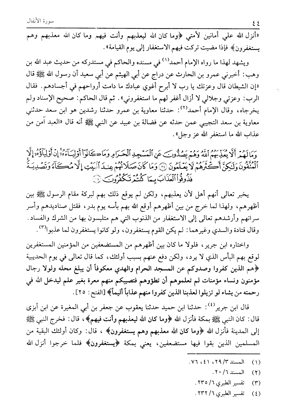 «أَنْزَلَ اللَّهُ عَلَيَّ أَمَانَيْنِ لِأُمَّتِي وَما كانَ اللَّهُ لِيُعَذِّبَهُمْ وَأَنْتَ فِيهِمْ وَما كانَ اللَّهُ مُعَذِّبَهُمْ وَهُمْ يَسْتَغْفِرُونَ فَإِذَا مَضَيْتُ تَرَكْتُ فِيهِمُ الِاسْتِغْفَارَ إِلَى يَوْمِ الْقِيَامَةِ» .