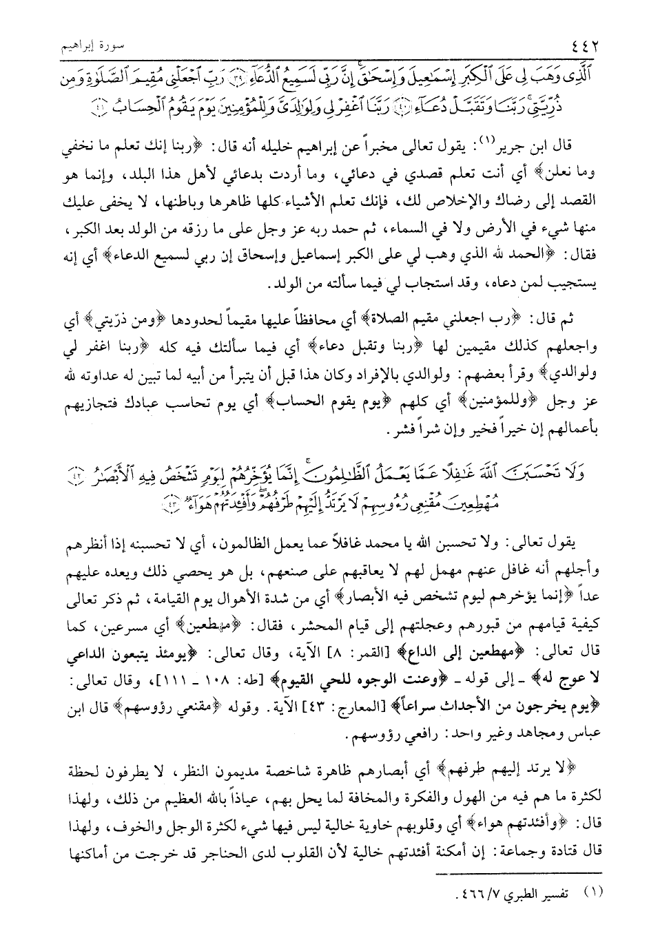 وَلا تَحْسَبَنَّ اللَّهَ غافِلاً عَمَّا يَعْمَلُ الظَّالِمُونَ إِنَّما يُؤَخِّرُهُمْ لِيَوْمٍ تَشْخَصُ فِيهِ الْأَبْصارُ (42) مُهْطِعِينَ مُقْنِعِي رُؤُسِهِمْ لا يَرْتَدُّ إِلَيْهِمْ طَرْفُهُمْ وَأَفْئِدَتُهُمْ هَواءٌ (43)