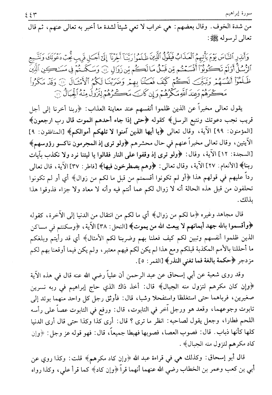 وَأَنْذِرِ النَّاسَ يَوْمَ يَأْتِيهِمُ الْعَذابُ فَيَقُولُ الَّذِينَ ظَلَمُوا رَبَّنا أَخِّرْنا إِلى أَجَلٍ قَرِيبٍ نُجِبْ دَعْوَتَكَ وَنَتَّبِعِ الرُّسُلَ أَوَلَمْ تَكُونُوا أَقْسَمْتُمْ مِنْ قَبْلُ مَا لَكُمْ مِنْ زَوالٍ (44) وَسَكَنْتُمْ فِي مَساكِنِ الَّذِينَ ظَلَمُوا أَنْفُسَهُمْ وَتَبَيَّنَ لَكُمْ كَيْفَ فَعَلْنا بِهِمْ وَضَرَبْنا لَكُمُ الْأَمْثالَ (45) وَقَدْ مَكَرُوا مَكْرَهُمْ وَعِنْدَ اللَّهِ مَكْرُهُمْ وَإِنْ كانَ مَكْرُهُمْ لِتَزُولَ مِنْهُ الْجِبالُ (46)